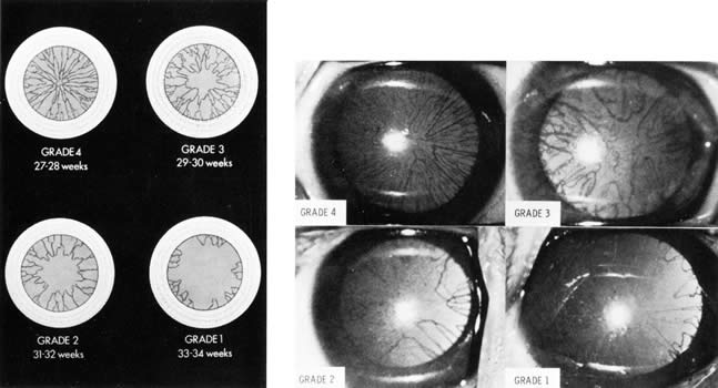 two. Estimation of gestational age is obstetrically based on the menstrual history, evaluation of known physical milestones during pregnancy, ultrasonographic and x-ray parameters, and the analysis of various chemical constituents of amniotic fluid. Gestational age estimates of neonates are made from various physical and neurodevelopmental attributes that appear predictably at known gestational ages.197,198 Involution of the anterior portion of the tunica vasculosa lentis (pupillary membrane) occurs predictably with gestational age.199 Direct ophthalmoscopic examination of the pupillary membrane within the first 24 to 48 hours of life, aided by dilating the pupil, allows an arbitrary grading that is highly correlated with gestational age (Fig. 9). This assessment is also valid for most infants who are small for gestational age (SGA).200 Its value in multiple pregnancy has been questioned.201 Abnormal persistence of the pupillary membrane and asymmetry between the eyes occur with congenital toxoplasmosis, rubella, cytomegalovirus, and herpes simplex infection.202 Premature infants have a higher incidence of central nervous system dysfunction resulting from metabolic imbalance, hypoxemia, intraventricular hemorrhage, and other insults. Sequelae include optic pathway disturbances such as optic atrophy and cortical blindness. Cerebral palsy is more common and frequently associated with strabismus.203 Even without central nervous system dysfunction or ROP, the incidence of strabismus and refractive errors (especially myopia and astigmatism) is higher in premature neonates.204 Transient lens changes appearing as clusters of small vacuoles at the lens periphery occur at the apexes of the Y suture.205 Other major ophthalmic considerations for premature neonates, such as ROP, vitamin E, and phototherapy for hyperbilirubinemia, are discussed elsewhere in this text. Neonates with weight below the tenth percentile for gestational age are considered SGA. Similar terms include small-for-dates, pseudopremature, and intrauterine growth retarded. In the United States, approximately one third of all infants whose birth weight is less than 2500 g are SGA and not premature.206 Factors that influence intrauterine growth adversely can be divided into three categories: maternal, placental, and fetal. Maternal causes include low prepregnancy weight, poor nutrition, hypertension, preeclampsia, diabetes, congenital heart disease, sickle cell disease, autoimmune disease, drug ingestion, and multiple gestation. Any type of placental insufficiency such as chronic abruption, anatomic abnormalities or TORCH infection (villitis) may cause decreased intrauterine growth. Fetal factors involve chromosomal abnormalities, syndromes (Cornelia de Lange), metabolic disorders (galactosemia), and congenital infection (TORCH).207 |