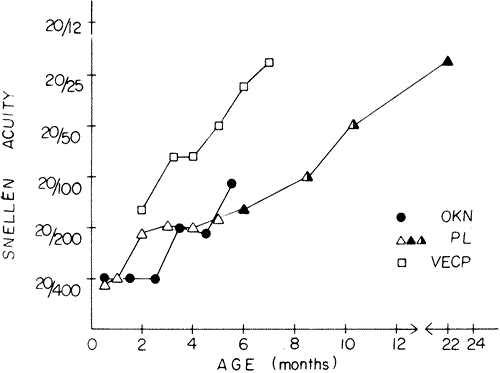 CLINICAL EVALUATION Clinical assessment of central vision in neonates requires both experience and patience. Preliminary assessment should include evaluation of pupillary responses, observing alignment, noting the presence or absence of nystagmus, and demonstrating motor ability.299 Pupillary constriction to light should be present after 32 weeks postconception age.300 Neonates of less than 32 weeks' gestation may have fixed and dilated pupils.301 Pupillary constriction to darkness may be found with Leber's amaurosis, cone dystrophy, congenital stationary night blindness, congenital achromatopsia, albinism, Best's disease, optic nerve hypoplasia, dominant optic atrophy, anomalies of optic nerve development, congenital nystagmus, strabismus, and amblyopia.302 Strabismus often occurs with monocular visual loss on any basis. Nystagmus occurs between 1 and 3 months of age, when binocular visual loss prevents the establishment of the macula fixation reflex. Opacities of the ocular media and retinal and optic nerve dysfunctions may be etiologic. Once well developed, this nystagmus is permanent and sharp foveal fixation cannot be re-established, relegating vision to 20/200 (6/60) at best. It is not usually found with cortical visual impairment. A strong light induces blinking even in the most immature infant.303 Turning toward a diffuse light falling on one side of the face usually can only be demonstrated between 32 and 36 weeks'postconception age.303 Fixation-and-following movements should be demonstrable by 3 to 4 months of age.304 Fixation and following may be elicited in most newborns if care is taken that they are alert and presented with proper stimuli. Neonates particularly fix and follow the human face or its likeness.305 The technique of testing for fixation and following should include binocular and then monocular assessment.306 In neonates, the following may be a jerky saccadic pursuit movement, which represents a series of hypometric saccades to localize the target.307 If following cannot be demonstrated, it should be verified that the motor system is intact. Range of motion and the ability to generate a saccade may be assessed by inducing vestibular nystagmus by rotating the child.308 The assessment of neonatal visual acuity is important for proper diagnostic and early intervention considerations. Because vision development is delayed in some infants who subsequently develop normal visual capability,309,310 prognostication must be done cautiously. Visual inattention may be a sign of significant neurologic sequelae such as cerebral palsy, mental retardation, and seizures, especially in preterm infants.311 Underestimating or overestimating a child's visual potential may have serious consequences. MEASUREMENT TECHNIQUES Techniques are now available to help assess the visual resolution capability of the very young. These techniques include VECP, optokinetic nystagmus (OKN), and PL responses. Each of these demonstrates a dramatic improvement in “acuity” during the first year of life (Fig. 10).312–317 That each of these techniques yields somewhat different results is not surprising. The different stimuli used and response parameters measured determine the particular visual function and level being assessed. Each of these techniques is clinically useful for evaluating visual resolution in the very young. Inconsistency in visual acuities determined by preferential looking technique and VECP has been demonstrated. Children with developmental delay may have poorer performance on preferential looking techniques. Severity of developmental delay correlates with greater disparity.318 Repeat testing using the same technique is necessary to document information used in a child's management. Visually Evoked Cortical Potentials By presenting a resoluble stimulus to a very young infant while monitoring and computer analyzing the resultant occipital cortical responses, an acuity function is obtained.313,316,319 Various stimuli, including flashed checkerboards, alternating checkerboards, and gratings, have been used. Acuity function estimates are made by an analysis of the computer-averaged waveforms and amplitudes. This is variously accomplished by comparing various waves with data from optically blurred adults, determining the smallest stimulus pattern producing a measurable VECP, or extrapolating to zero-response amplitude a series of waves produced by various stimuli. General agreement exists among the different techniques used in VECP acuity estimates.313,319 VECP acuities are in the range of 20/400 (6/120)* during the first days of life, improving to close to normal adult 20/20 (6/6) equivalent responses by 5 to 6 months (Fig. 10).278,320–323 When a more rapid spatial frequency sweep VECP technique is used, even better neonatal acuity has been found.319 *Metric equivalent given in parentheses after Snellen notation. Considerations in assessing the significance of VECP acuities include the following: Primary reception areas and not higher cognitive areas are monitored. The small signals detected by computer averaging of many responses may not be of threshold level for higher neural processing. Optokinetic Nystagmus OKN is an involuntary response elicited by moving a series of objects across the visual field. OKN may be elicited in an awake neonate placed under a field of moving stripes. By varying the stripe width while observing for OKN, an acuity function is measured. Observation may be direct, by cinephotography, or may use electroretinography.324 Snellen acuity equivalents in the range of 20/300 to 20/400 (6/90 to 6/120) have generally been found for full-term newborns during the first week of life.325,326 Acuity as high as 20/150 (6/45) has been recorded in neonates but may have been the result of spurious techniques.313 Premature infants show lower acuities.327 Acuity as measured by OKN improves markedly during the first 6 months of life. Improvement from 20/400 to 20/100 (6/30) has