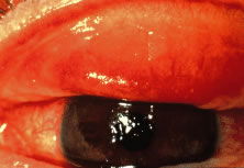 Ocular infections with bacteria after BMT are uncommon, perhaps in part because of routine, intensive antibiotic use when there is any evidence of infection after the procedure. Fungal endophthalmitis was found after BMT in only 1.5% of patients in one report; viral (CMV or varicella-zoster virus) or toxoplasmic retinochoroiditis was even less common.334 Fungal infections tend to occur in the first 4 months after BMT, whereas viral and parasitic infections occur later.334 Intraocular infections may have atypical features, and vitreous or endoretinal biopsy may be necessary to make a definitive diagnosis.334 Early relapse of leukemia may simulate fungal endophthalmitis.334 Cataracts develop in 10% to 23% of patients after BMT.335–338 Even though GVHD alone may be a risk factor for cataract formation, the medications used in conjunction with BMT, in particular corticosteroids, as well as total body irradiation, are probably more important factors.336–338 The use of fractionated total body irradiation has markedly reduced the frequency of cataracts after BMT.337 An occlusive retinal microvasculopathy has been described in 4% to 10% of patients after BMT.326,334,339 It appears to be more common in patients treated for leukemia, and there have been suggestions that it may be related to the use of total body irradiation, cyclosporine, or cytarabine hydrochloride; in one series, however, it was related most strongly with GVHD.334,339,340 Optic disc edema may be seen after BMT and has been thought to be an idiosyncratic reaction to cyclosporine use in some cases.341 Other causes of optic disc edema, such as meningitis, intracerebral hemorrhage, and relapse of leukemia in the CNS should be considered in the differential diagnosis. Other ocular findings of GVHD include cicatricial lagophthalmos, ectropion following lichenification of the skin of the eyelids, pseudomembranous conjunctivitis (see Fig. 7), corneal ulcers, iritis, and histologic evidence of choroiditis.328,329,342 Subconjunctival, retinal, and vitreous hemorrhage may occur early in the posttransplant period, as a result of induced bone marrow aplasia, but the risk of vision loss is low.334 Ocular problems do not usually develop in patients who survive BMT without developing severe GVHD, but patients with chronic GVHD and dry eye have a low probability of recovery of normal tear function.329 Continued treatment of dry eye is therefore usually necessary. |