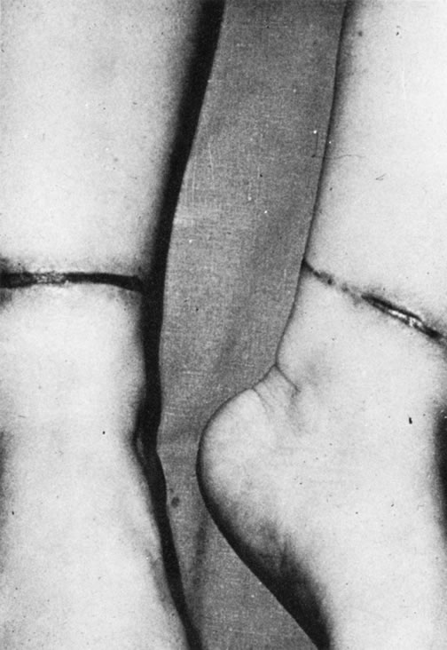 Approximately 10% of all cases of child abuse involve burns.13 The most frequent cause of burns in abused children is scalding with hot water.13,14 The buttocks and perineum are frequently burned areas. Full-thickness, symmetric burns of the hands or feet suggest strongly that the extremities were held in a hot liquid (Fig. 5). Another commonly inflicted burn is from a cigarette. These lesions are often found on the palms, soles, or abdomen and often have an excavated center with raised edges.