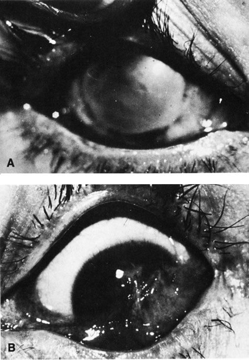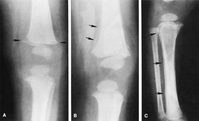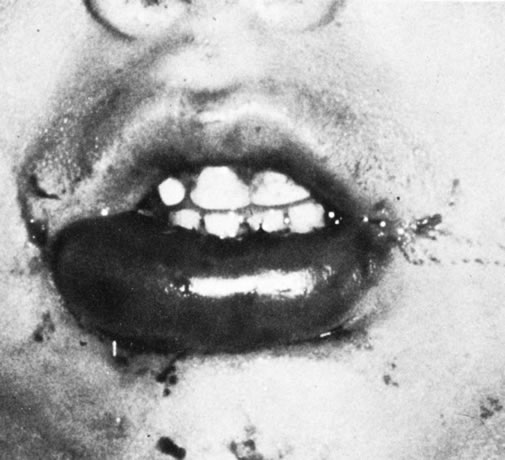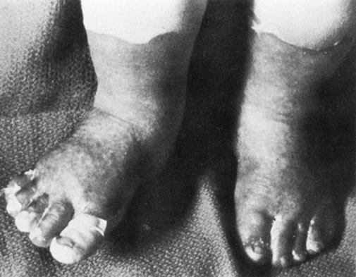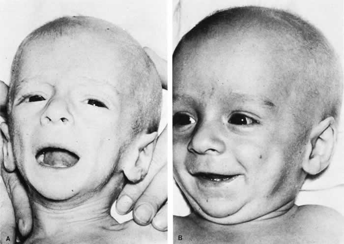 will intervene as parental understanding has been demonstrated. Another form of neglect is nonorganic failure to thrive (Fig. 13). Children with this condition may become emaciated either from starvation or from failure to thrive despite the provision of food. The latter situation is believed to be due to hormonal effects brought on through poor parent-child binding and attachment. Although ocular manifestations are rare, children with corneal exposure and epithelial breakdown have been observed, largely due to lagophthalmos because they listlessly remain unmoving in their debilitated state. Physical trauma, including bruising, burns and fractures, may also accompany failure to thrive. |