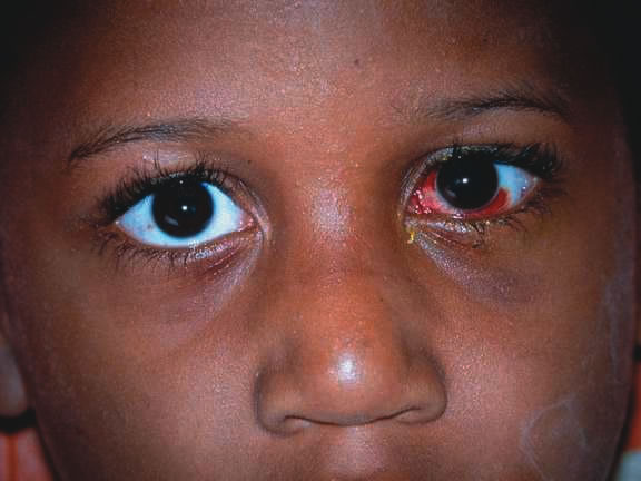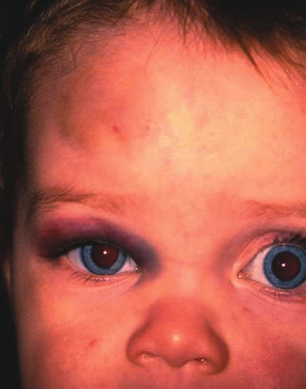 THE BATTERED CHILD—OPHTHALMIC MANIFESTATIONS The spectrum of ocular findings in the battered child is vast. Essentially any injury to the eye or adnexa could be due to abuse. An ocular injury may be as mild as periorbital edema or as severe as a ruptured globe. Signs of bilateral ocular trauma suggest inflicted injury because accidents usually involve only one eye. Perhaps one exception is bilateral periocular ecchymosis due to an accidental, single, central forehead trauma (Fig. 6). However, periorbital ecchymosis may also be caused by inflicted trauma with or without injury to the underlying globe. Attempts to date bruises by their color, particularly when the blood is accumulated in the loose skin of the lids, is notoriously unreliable.