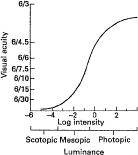 Visual discomfort from glare and other sources accumulates during the work day, and task rotation may be a reasonable preventive measure if other adjustments are not successful. CONTRAST. The eye detects objects by responding to the differing levels of illumination at the target edges, or contrast29: Contrast = <fr background illumination - target illumination/background illumination> To determine the optimal illumination levels for a task, the contrast and size should be measured. It is difficult to measure the contrast of a practical task. These vision standards, either mandatory (e.g., DOT) or voluntary (Purdue Standards), apply to tasks of normal contrast and reflectance. If, however, the contrast or reflectances are low and mistakes are made because of wrong perception, these are likely to be dangerous or costly. The recommended illumination should be increased to compensate for the decrease in contrast of the object considered. Concerns regarding the visibility of tasks have influenced the American codes for lighting.46 The initial experiments carried out investigated the threshold detection of static disc targets, and later experiments involved the detection of dynamic targets. The dynamically presented targets were believed to create conditions more similar to a practical task. More recent studies have investigated the effects of lighting on the visual performance of a 20- to 30-year-old age group.47 Older individuals require more light than younger ones to perform a similar task.29 COLOR. Deficiencies can be either congenital or acquired. The ability to discriminate colors is particularly influenced by age and illumination. It has been shown that with age there are more errors in hue discrimination in the blue-green and red regions.48 This study showed that the number of sorting errors in the FM 100 hue test could be reduced by increasing illumination.48,49 TIME AVAILABLE TO VIEW TASK AND MOVEMENT OF THE TASK. The time available to see the task is important; too short a time exposure will reduce the visibility, especially if the task is moving.29 The time available to view the letters and so forth will influence the visual acuity measured. It has been estimated that a person can transmit up to 10 bits/second (a bit is a unit of information processed in a second) of visually displayed information. This is a very small amount of information, when it is estimated that the human sensory system has a capacity to transmit millions of bits per second. Therefore, it is not only the input of the visual system that limits the visual performance but the processing, decision making, and motor output. Letters can usually be recognized in under a second, and, obviously, the better the illumination and the larger the letter, the faster the recognition time. ATMOSPHERIC CONDITION. Atmospheric conditions in such industries as foundries and mining, in which there may be dust, smoke, or steam, will reduce visibility because of the absorption of light.29 Interactions of Luminance, Contrast, and Glare Three major factors that influence visual acuity are luminance, contrast, and glare. The influence of luminance on visual acuity may be plotted (Fig. 3). The capacity of the visual system to resolve details increases with increasing luminance, although there is a level beyond which visual acuity does not increase; in fact, it may diminish because of disability glare. Contrast has a maximal effect on visual acuity at low levels of illumination but has a minimal effect at high levels. Spalton and colleagues,50 in their slide atlas of ophthalmology, state that the graph of visual acuity plotted against contrast shows the rapid improvement in acuity as contrast increases and the difference that background illumination makes to the acuity under the same conditions of contrast (Fig. 4). In clinical acuity tests black letters are displayed on a white background giving a contrast value of approximately 80%. In the normal eye under photopic conditions the threshold contrast is about 1%. The following example relates the association of distance and decreased contrast. The eye with a visual acuity of 20/40 visualizes a 1.0 mm-target at 14 in. (35 cm). At 28 in. by doubling the distance without change in size, the eye will require a visual acuity of 20/20 with high contrast. Using Figure 4, working at moderate contrasts would require a visual acuity of 20/05, a visual acuity not readily available in most human beings. In essence, doubling the distance doubles the visual requirement, and decreasing the contrast also doubles the visual requirement. Visual Factors for Specific Task There are occasions when on-site analysis is not possible. A logical method for determining the visual factors required for a particular task was devised by Grundy.51 From the knowledge of the distance and size of the critical detail of the task, the visual acuity necessary to discriminate the smallest detail can be determined. This can be calculated easily from a simple graphical method by using a nomogram, shown in Figure 5. For example, a task has a critical detail of 0.6 mm and is viewed at 70 cm. When a straight line is drawn through these values it will intercept the right-hand scale to indicate that the corresponding visual angle is 3.0 minutes of arc and the minimum visual acuity required is 6/18. It is important to remember that the values given are a measure of the resolving power of the eye, and higher standards are required for the task to be carried out for prolonged periods. It has been suggested that the visual acuity necessary for a demanding task should be approximately twice the minimum value.52 Therefore, in the previous case, a visual acuity of 6/9 is advised. The employee can often move closer to the task, increasing the angular subtense at the eye, but this depends on the amount of accommodation and convergence available. The older presbyopic employee, who has a reduced amount of accommodation, may need an intermediat