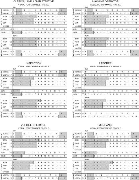 There are jobs so highly specialized that they never fall into any one group. The minimum visual standards for each of these jobs must be established clinically by the observation and visual ergonomic methods. The investigation of specialized jobs is not only necessary but is an intensely interesting and often a thrilling experience. Constant and continued study of visual job demands on visual capacities is the primary dictum to all parties concerned. Visual profiles and minimum visual standards are outlined in Figure 6. Although the Ortho-Rater was the testing instrument, it can actually be used with any reliable battery instrument (e.g., Titmus and Stereo Optical current models) or with individual tests on the basis of the clinical equivalents. The unique and exhaustive research contribution, on which the whole structure of fact-finding techniques and basic evaluation of visual skills has been laid, can now be the broad basis for professional thinking in visual skills (physical capacities) as matched to visual demands. It is also important to differentiate between visual standards for hiring—which vary often, according to state law—and placement standards. This chapter discusses the latter. Kephart55 discussed methods in which the relationship between each of the 12 tests and performance on the job was investigated to determine the pattern of visual skills required by a job. When comparisons have been made on the basis of the individual tests, the results are pooled and the resulting pattern of visual skills is expressed as a battery of tests with varying cut-off scores. Not all jobs require the same pattern of visual skills. The job profiles, published in countless reports, are the result of careful and long-continued research involving large numbers of workers in a large variety of jobs. Such patterns must always be arrived at by a careful observation of large numbers of statistically demonstrated relationships between test scores and job success. VISUAL JOB FAMILIES Tiffin26 has shown that jobs differ both in the types of visual skills they demand and in the quantity of these visual skills required of the worker. Just as there are differences between types of jobs, however, there are also similarities. As we noted differences in visual activities between such jobs as crane operator and radio assembler, there are observed similarities in visual activities between jobs, such as lathe operator and milling machine operator. Similarities between visual requirements of jobs are as important as differences between jobs. Over a number of years, the Purdue University Occupational Research Center26 has collected data involving visual test scores and measures of job success for several thousand different industrial jobs. A careful analysis of the relationships between vision test scores and job success has shown that there are certain groups of jobs that are similar to each other in visual requirements. Within each group the visual requirements of the jobs are similar, but the requirements of each group vary from those of the next group. Thus, we have a series of job groupings that represent a different pattern of visual requirements, although the jobs within each group are essentially similar in visual requirements. This has led to the concept of visual job families. A visual job family is composed of a group of jobs whose visual requirements are similar.26 The requirements between families, however, differ. In the early development of industrial ophthalmology, six visual job families were identified.23,26,56 It is felt that most industrial jobs will fall into one of these six groups in the visual demands the job makes on the worker. The visual requirements of Bausch & Lomb Ortho-Rater test scores of each of the six job families are given in Figure 6.23 These findings are provided in Tables 2, 3, 4, 5, 6, and 7 as Column A. Kuhn, based on her extensive experience (1935 to 1950), devised minimum visual standards for use by medical directors and consultants. They are the same main groups, but they are expressed in clinical terms and differ occasionally (listed in Tables 2, 3, 4, 5, 6, and 7 as Column B). The profile and group numbers in Tiffin,26 Kuhn,23 and Novak56 do not agree but the family names do, and, therefore, they have only been used in Tables 2, 3, 4, 5, 6, and 7. (It is important always to remember that these are minimum requirements.) The sketches are presented with the knowledge that they are not complete descriptions of the groups (Tiffin,26 Kuhn,23 and Novak56).