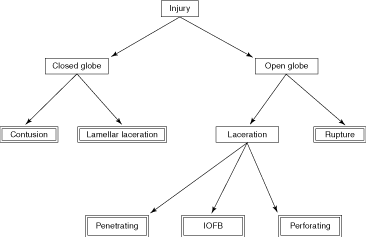 insurance plan. A NEW STANDARDIZED CLASSIFICATION OF OCULAR TRAUMA (BIRMINGHAM EYE TRAUMA TERMINOLOGY (BETT) A new classification73 has been endorsed by the AAO, Board of Directors of the International Society of Ocular Trauma, United States Eye Injury Registry, the Hungarian Eye Injury Registry, the Vitreous Society, the World Eye Injury Registry and the Retina Society (Fig. 8). When the system was published in 1996, it was reasonably expected that the system eventually will become the standardized international language of ocular trauma. Ophthalmologists were urged to use this terminology in clinical practice and research.74 It is mandated by Graefes Archives, Klinische Monatsblätter, and Ophthalmology. Definitions in medical dictionaries are tailored toward general medical use and cannot be effectively applied to ocular trauma. The new system always uses the entire globe as the tissue of reference; therefore, the type of the injury is described unambiguously without the need to indicate the tissue involved. When a tissue is specified, it refers to wound location not to injury type. A corneal penetrating injury, thus, involves an open globe injury with the wound being in the cornea. The system provides unambiguous definitions for each term (Table 10) and a complete classification of injury types.