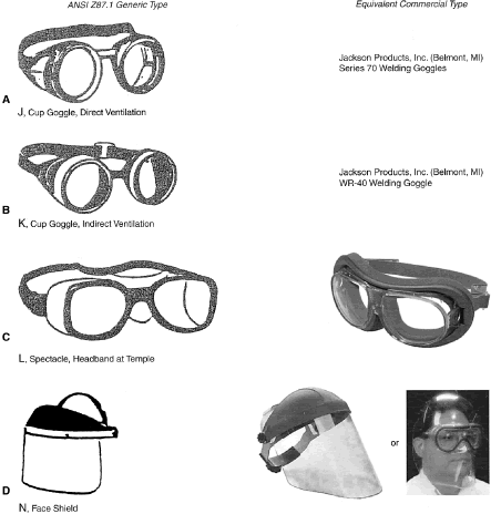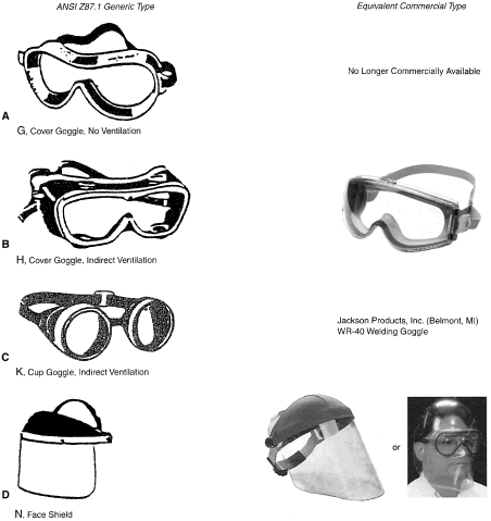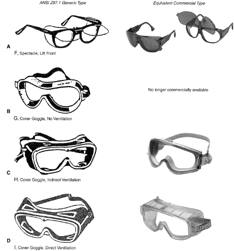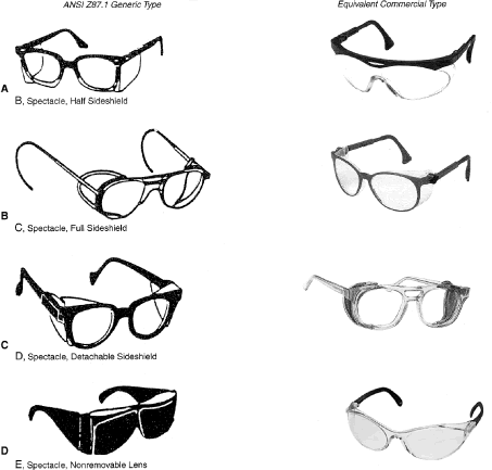 Identification of Personal Eye and Face Protection Equipment Appropriate protective equipment for the eye and face is required by OSHA (29CFR 1910.133).81 Eye and face protection is required where there is reasonable probability of preventing injury with such equipment. Other standards (ANSI Z136.1)82 and Z136.383 reflect on the prevention of laser burns, using similar engineering controls or personal protective goggles. All employees should acquire PPE appropriate for their activities or processes. Employees shall have types of protection suitable for the work to be performed and conveniently available. Employees should be required to use such equipment. No unprotected personnel should be subjected to hazardous environment conditions. These stipulations apply to supervisors, management personnel, and visitors while they are in hazardous areas. A summary of a questionnaire administered to patients who presented to the Massachusetts Eye and Ear Infirmary emergency services with ocular injuries in 1985 was reported by Schein and coworkers.14 All injuries were included except those resulting from contact lens use. Only 66% of those injured at work reported that protective eyewear was provided at the job site. Of those suffering severe injury, only one third reported that protective eyewear was available. Among those injured at work, 10% stated they were wearing protective eyewear at the time of injury, and none of these injuries was severe. Ruptured globes were the most common severe injury occurring at work. In approximately one third of the cases, a history of previous eye injury was obtained. Schein illustrated the type of eyewear worn at the time of injury for the study population: 70% were wearing no glasses, 10% wore safety glasses (of which 2% had side shields), 6% wore regular glasses, and 3% wore contact lenses. One third of the subjects whose regular glasses were broken at the time of trauma suffered severe injury. A 1980 Bureau of Labor Statistics Study84 noted about 60 % of workers who suffered eye injuries were not wearing eye protective equipment. When asked why they were not wearing face protection at the time of the accident, workers indicated that face protection was not normally used in their type of work, or it was not required for the type of work performed at the time of the accident. The United States Eye Injury Registry's 1996 report on 10,964 cases for the period 1988 to 2001 revealed that 62.5% of injured patients wore no protection and 2.7% wore regular streetwear spectacles, 1.5% safety eye and face protection, and 0.3% sun spectacles. The U.S. Food and Drug Administration regulation requires that all streetwear eyeglasses and sunglasses sold to the general public be shatterproof resistant.85 TYPES OF HAZARDS VERSUS PPE. Although PPE is part of the job in some industries such as face shields for welding it is considered a last-resort, temporary type of protection for most. The elimination of hazards in the environment, rather than PPE, is optimum.30 No single combination of protective equipment and clothing is capable of protecting against all hazards. PPE should be used in conjunction with other protective methods. The use of PPE can also produce significant worker hazards, such as heat stress; physical and psychologic stress; and impairments in vision, mobility, and communication. In general, the greater the levels of PPE protection, the greater are the associated risks. Equipment and clothing should be selected that provide an adequate level of protection. Overprotection or underprotection can be hazardous and should be avoided. Using PPE improperly or in a manner unsuited to its design and purpose is worse than using no protection. Without any protection, the worker knows that he is vulnerable and will perhaps take precautions. With inadequate protection, the worker may rashly blunder into severe difficulty because of a false sense of security. OSHA 29CFR 1910.13381 mandates the ANSI Z87.1 Eye and Face Protection41 regulations in which a table in ANSI Z87.1A correlates the basic types of eye hazards with the specific general type of spectacle and/or face shield required for the hazard. This table provides excellent guidance on the selection of types of eye/face safety equipment required. Although not mandated by OSHA, these requirements should be implemented when eye hazards exist in hobbies, at home, in school, in sports, or workplace where there is a reasonable probability of preventing injury when such equipment is used.21 The ANSI Z87.141 tables on protective devices are only representative of eye and face protective devices commonly found at the time of the writing of the standard. Protective devices do not need to take the exact forms shown, but must meet the requirements of the standard. In Figures 9, 10, 11, 12, 13, 14, 15, 16, 17, 18, 19, and 20, the generic types from ANSI Z87.141 are shown under the specific classes of hazards. The generic protective devices are compared with current nonprescription safety equivalent devices. Blais27 submitted a new organization of existing ANSI Z87.1 tables information that enables the user to identify the specific type of lens mandated by 29CFR 1910.133.81