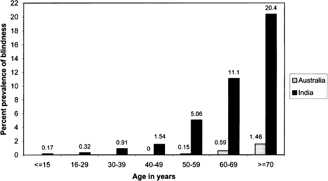 PREVALENCE Increase in the prevalence of blindness with increasing age has been reported in population-basedstudies from Africa,13–16 Asia,17–20 Australia,8,21,22 Europe,23 North America,7,24 and for the global data considered together.25 The age-specific rates of blindness are considerably higher in developing countries13–20 than in the developed countries.7,8,21–24 For example, blindness defined as presenting distance visual acuity less than 20/200 or visual field less than 20 degrees in the better eye was present in 0.43%, 4.56%, and 15% of those younger than 40 years, 40 to 64 years, and 65 years of age or older, respectively, in the population of the Indian state of Andhra Pradesh.20 These rates are 13 to 30 times higher than the 0.15% and 1.15% prevalence of blindness, defined as presenting distance visual acuity less than 20/200 or visual field less than 10 degrees in the better eye, reported from Victoria, Australia, in the 40 to 64 years and 65 years or older age groups, respectively22 (Fig. 1).