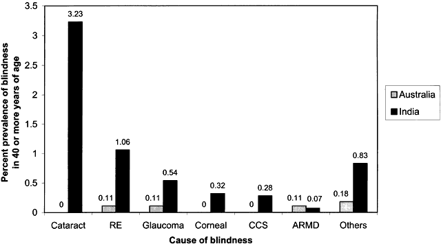 A recent study from India has reported a high prevalence of 0.28% blindness (visual acuity less than 20/200 in the better eye) in the population 40 years of age or older because of complications resulting from poor-quality cataract surgery.20 This implies that one of every 360 persons 40 years of age or older in this population is blind with this definition from complications of cataract surgery. A high rate of blindness in the population from complications of cataract surgery also has been reported from Saudi Arabia.52 Frequent poor visual outcome after cataract surgery has been reported recently in studies from China, India, and Nepal.53–58 There is a need for more attention to the quality of cataract surgery and postoperative care if this iatrogenic blindness is to be reduced. In parts of Africa where trachoma is endemic, it has been reported to be the second most common cause of blindness after cataract (see Table 1)15,16 and in some places even the most common cause.59 Trachoma also has been reported to be the leading cause of blindness in an Australian Aboriginal population.51 Onchocerciasis has been reported to be the predominant cause of blindness in some endemic areas of Africa.32 Both these infectious causes of blindness are preventable. The other frequent reasons for corneal blindness in the developing countries include vitamin A deficiency in childhood, infectious keratitis including that caused by measles and ophthalmia neonatorum, and use of harmful traditional eye medicines,20,28,29,59 all of which also are preventable. Glaucoma has been reported to be a prominent cause of blindness in some parts of Africa14,15 and in India20 (see Table 1). All of the blindness due to glaucoma was attributed to chronic open-angle glaucoma in a South African population,14 whereas one third of all blindness due to glaucoma was attributed to primary angle-closure glaucoma in an Indian population.20 The most common cause of blindness in the developed countries is age-related macular degeneration21–23,33 (Table 2). The other important causes of blindness are primary open-angle glaucoma22,23,33 and refractive error22 (Fig. 4). Cataract also has been reported as a cause of blindness in some studies.23,33 The cause-specific rates of blindness, except for age-related macular degeneration, are many times lower in the developed countries than in the developing countries as a comparison between two studies from Australia and India illustrates (see Fig. 4).