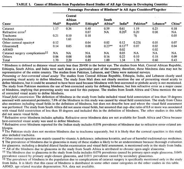 in the developed countries.21–23 However, blindness is still a significant public health problem in most developing countries. Because of poverty and inadequate community health measures, blindness due to trachoma and vitamin A deficiency is still prevalent in many parts of Africa and Asia.15,16,28,32,59 In addition, most of Africa has few ophthalmologists or other adequately trained professionals to provide the basic refractive services and cataract surgery.1,60 Many Asian countries also have a serious deficiency in the availability of eyecare providers, although not as extreme as in Africa. For example, it is estimated that in the year 2000, Africa had fewer than one ophthalmologist for every 500,000 population, and Asia had one for every 200,000 population.1 India has one ophthalmologist for every 100,000 people, but most are based in urban areas, which have less than 30% of the country's population. The number of personnel available for providing refractive services is estimated as one for 250,000 population in the developing world.1 Because of this deficiency of eyecare providers and the lack of adequate infrastructure, the easily treatable blindness due to cataract and refractive error is high in many developing countries.13–16,20,39 The estimated worldwide distribution and the causes of blindness are listed in Tables 3 and 4.