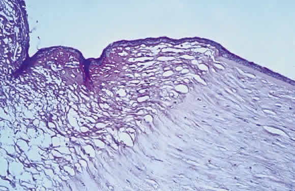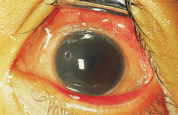 Bitot's spots are foamy, cheesy accretions of desquamated keratin and saprophytic bacilli overlying an area of conjunctival xerosis26,48 (Fig. 4). They are more easily recognized than milder xerosis and carry the same significance. Bitot's spots (and conjunctival xerosis) occasionally are unassociated with active vitamin A deficiency and remain unresponsive to vitamin A therapy.49,50 These lesions, which usually are limited to the temporal quadrant of older children, generally are sequelae of old xerophthalmia. For reasons not well understood, but in which exposure, chronicity, and age of the child probably play a role, the keratinizing metaplasia induced by vitamin A deficiency persists even after the original stimulus has been removed by improved vitamin A nutriture. Responsive lesions usually heal rapidly, most often within 1 to 2 weeks of treatment.48 Some persist in milder form for months to years, waxing and waning in size even after complete replenishment of vitamin A stores. They do not recur after simple excision26 or arise de novo in previously normal, vitamin A-supplemented individuals.43 CORNEAL XEROSIS The earliest corneal manifestation of vitamin A deficiency is fluorescein-positive superficial punctate keratopathy, which often is limited to the inferonasal quadrant.51 Although undetectable by hand light examination, it is already present in most persons with night blindness and Bitot's spots. With progression, the punctate lesions become more numerous and denser and cover a larger area. By the time corneal involvement is appreciated on hand light examination, the entire surface usually is involved. Stromal edema soon ensues.2,23 Frank, horny keratinization occasionally occurs, usually inferiorly or in the interpalpebral zone. The earliest corneal abnormality seen on hand light examination is a mild superficial haziness, usually most severe and occasionally only apparent inferiorly, probably the result of the dense punctate keratopathy and accompanying edema.52 Fluorescein staining may be grossly apparent even without a slit lamp. Progression imparts a dry, pebbly appearance to the cornea (see Fig. 3). The patient may be photophobic, but the eye is white and quiet. Conjunctival xerosis and night blindness usually are present, and the condition usually is bilateral. Uncomplicated corneal xerosis responds rapidly to systemic vitamin A therapy. Healing begins within 1 to 4 days and usually is complete by 1 week. CORNEAL DESTRUCTION The earliest, mildest, and most classic of xerophthalmic ulcers is a small, sharply punched-out partial or full-thickness defect, usually located in the periphery of the nasal quadrant2,52 (Fig. 5). Fullthickness defects usually are plugged by iris, with the anterior chamber remaining formed. They heal rapidly on vitamin A therapy. Larger, more irregularly shaped ulcers, usually in the same location but occasionally extending to the pupillary axis, are more advanced variants of this same process, although occasionally secondary bacterial infection intervenes. Localized stromal destruction may resemble full-thickness liquefactive necrosis (keratomalacia) (Fig. 6). The sharply demarcated lesion has a swollen, opaque, grayish yellow appearance. The stroma usually sloughs, leaving a descemetocele below. Treatment speeds healing, resulting in restoration of corneal integrity2,52 and usually near-normal acuity (Fig. 7). In the most severe involvement, stroma sloughs from limbus to limbus with loss of the anterior chamber (Fig. 8). Secondary infection probably plays an important role in many cases of extensive necrosis. Healing is by slow fibrovascular ingrowth from the periphery and adjacent iris. The extensive scarring usually is weak and forms a protuberant staphyloma.