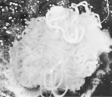 The blackfly larvae require well-oxygenated water to mature, and eggs are laid in rapids in fast flowing rivers and streams. Because of seasonal variation in volume and rate of flow, a particular stretch of river may be either a permanent breeding site or a temporary breeding site only at certain times of the year. Blackflies usually do not travel more than 1 or 2 km from their breeding sites, although at times they may be carried hundreds of kilometers by monsoonal winds. Female black flies require a blood meal to initiate ovulation, and it is during this meal that they may transmit or receive the onchocercal infection. THE PARASITE O. volvulus is one of a group of filarial nematodes. Other members include Wuchereria bancrofti and Brugia malayi, which produce lymphatic filariasis and elephantiasis and Loa loa, which causes loiasis. The adult worms live encysted in fibrous nodules, which may be single or conglomerate. Each nodule contains between two to three female worms lying in a twisted, tangled mass (hence the term volvulus). The adult female O. volvulus organism is a white threadlike worm, 30 to 70 cm long and only 0.3 mm across (Fig. 3). Adult males have a similar appearance but are thinner and much shorter (about 2.5 to 5 cm long). Adult female worms have a life span of 8 to 10 years but may live up to 15 years. During their lifetime, each releases millions of first-stage larvae, also known as microfilariae. A microfilaria is 320 to 360 μm long and 5 to 10 μm in diameter (Fig. 4) and lives for 6 to 30 months.1,2 In hyperendemic areas, the total microfilaria load in the body of affected individuals may be as high as 150 million.4
