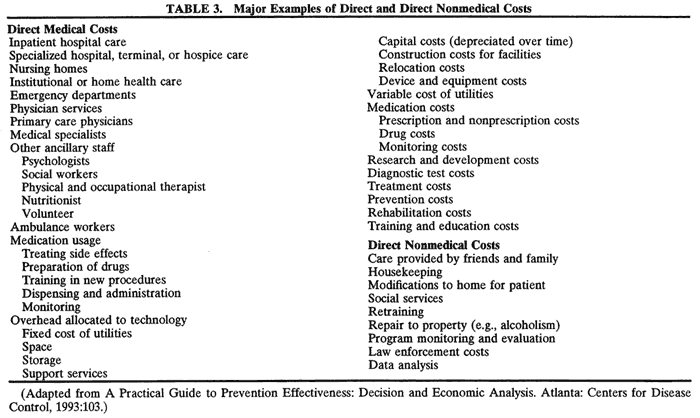 Direct costs account for such items as hospitalizations, drugs costs, physician's fees, laboratory costs, rehabilitation, and long-term care costs. Direct costs come in the form of charges, and the true medical costs may be obscured or difficult to measure, since they do not empirically measure the forgone opportunity cost of using these resources for other purposes. Direct costs can either be fixed (e.g., land or capital) or variable costs (e.g., labor). Costs such as hospital buildings, for example, are assumed to be inflexible in the short run and, thus, are fixed. Variable costs are more flexible in the short term, that is, they can be increased or reduced with much greater ease, as in the case of hospital staffing needs. Patient-based costs are derived from “costs borne by patients and their families, (and include) out-of-pocket expenses, patient and family input into treatment, time lost from work, and “psychic costs” attributable to pain and suffering.”3 Nonmedical costs such as transportation and support for ancillary workers, homecare workers, and other out-of-pocket expenses may be included to gain an overall picture of the costs of a given healthcare intervention from the patient's perspective (Table 4). The next step is to measure the costs of the healthcare interventions or program being pursued.