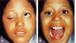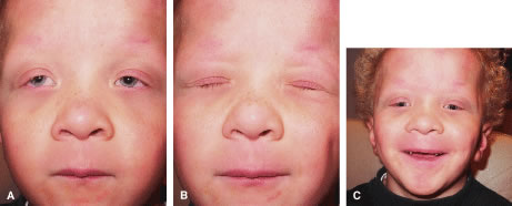 Superior rectus dysfunction is found in approximately 5% of congenital myogenic ptosis cases. The superior rectus muscle and LPS share similar embryologic origins. Here, abnormal fibrofatty tissue is seen in both muscles on biopsy.3 A concomitant maldevelopment of the superior rectus muscle seen in certain cases of congenital myogenic ptosis is called double elevator palsy or monocular elevation deficiency.2 In these patients, congenital myogenic ptosis is associated with poor Bell's phenomenon or vertical strabismus. Repair of congenital myogenic ptosis is difficult, because the pathophysiology involves an abnormal muscle, which can not be corrected surgically. Congenital Aponeurotic Ptosis Rarely, congenital ptosis may be aponeurotic in origin. Here, the ptosis is due to failure of the levator aponeurosis to insert at its normal position on the anterior tarsus. This may result from birth trauma, especially with forceps delivery. Usually there is good eyelid excursion yet an abnormally high eyelid crease. Congenital Mechanical Ptosis Mechanical ptosis can be a congenital abnormality resulting from a mass effect in the upper eyelid, brow, or orbit. Patients can present at birth with a hemangioma, dermoid, or plexiform neurofibroma, which are common causes of mechanical ptosis. Amblyopia can result from astigmatism induced from the mass effect on the globe or from obstruction of the visual axis resulting from the ptotic eyelid. Hemangiomas usually resolve spontaneously or respond to steroid injections.2 Removal of the offending dermoid will usually eliminate the associated mechanical ptosis. Ptosis associated with neurofibromatosis and plexiform neurofibromas is not easily corrected. The treatment is beyond the scope of the text. Congenital Neurogenic Ptosis Congenital neurogenic ptosis, though rare, is caused by innervational defects during embryonic development. The Marcus Gunn (Jaw-Winking) ptosis (MGJWP) is the most common type of congenital neurogenic synkinetic ptosis. It is observed in 4% to 6% of patients with congenital ptosis. This eyelid malposition and synkinetic movement involves an abnormal innervation of a normal LPS muscle causing the unilaterally ptotic eyelid to wink with jaw movement (Fig. 3). Synkinesis occurs from aberrant connections between the motor branches of the fifth cranial nerve that normally supplies the pterygoid muscle or the muscles of mastication and the superior division of the oculomotor nerve (CN-3) that innervates the LPS and superior rectus muscles.4 The aberrant connections in the central nervous system can be bilateral, although only one side is symptomatic, demonstrating the wink.5 Clinically, these patients usually have a baseline ptosis on the affected side in primary gaze. The wink is induced by use of muscles of mastication (e.g., sucking, swallowing, chewing, or a lateral motion of the jaw to either side). The wink consists of a rapid elevation of the ptotic lid to a position higher than the unaffected side and then an equally rapid descent back to the ptotic state.6 In this situation, ipsilateral hypotropia or vertical strabismus is common because the superior rectus muscle may be involved. The ptosis is often corrected with surgery. Excision of the levator aponeurosis seems to alleviate some of the symptoms of the jaw-wink and synkinesis before ptosis surgery. Some children with the associated jaw-wink develop adaptive behavioral mechanisms and learn to avoid movements that reduce the wink reflex. This has caused some clinicians to state that MGJWP ptosis improves with age. Congenital third nerve palsy is another type of neurogenic congenital ptosis. In these patients, blepharoptosis manifests along with deficits in adduction, elevation, and depression of the globe resulting from the innervation of the oculomotor nerve to the LPS muscle and rectus muscles. Mydriasis may be present depending on the severity of the paresis affecting the innervation to the pupillary dilator muscles. Congenital Horner's syndrome is a rare neurogenic type of ptosis, which evidences a mild ptosis, miosis, anhidrosis, and a decreased pigmentation of the iris and areola on the affected side.7 The ptosis is due to decreased function of the sympathetically innervated Muller's muscle of the upper eyelid. Decreased sympathetic tone to the inferior tarsal muscle results in elevation of the lower eyelid, further narrowing the palpebral fissure on the involved side, the so-called reverse ptosis of the lower eyelid. Although the lesion may be anywhere on the sympathetic chain, congenital Horner's is most often the result of a second-order neuron involvement from brachial plexus injury at birth. The classification of the first (central), second (preganglionic), and third (postganglionic) order neuron lesions along the sympathetic chain are discussed later in the chapter.8 Blepharocanthal Syndrome Another type of congenital ptosis that is inherited is the blepharocanthal syndrome. The inheritance is autosomal dominant and comprises about 5% of patients with congenital ptosis3 (Fig. 4).