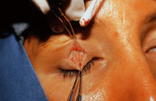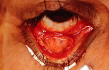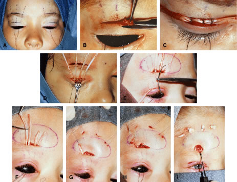 timing and necessity of readjustment. Benefits to early postoperative adjustment occur within the first 5 to 7 days after surgery. Minor adjustments of the sutures can be achieved a few days to a few weeks following surgery, usually as an office procedure in adults. Children normally require a trip back to the OR and eyelid readjustment under general anesthesia. It is recommended to use the original incision and approach for early postoperative adjustment. At this time, the edema has subsided, the original wound opens with ease, and there is little bleeding because capillaries have sealed (Fig. 16). Little distortion of tissue in readjustment during the early postoperative phase makes it possible to adequately assess eyelid position, contour, or eyelid crease. Following readjustment, wound healing is not disrupted, and the patients demonstrate little postoperative edema. Interruption of both the anterior and posterior lamellae at this early stage may compromise the lymphatic drainage and blood supply of the eyelid, resulting in extended postoperative edema and congestion.