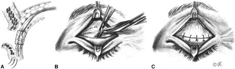 Procedure: (Fig. 15A to C) Corneal protective shields are placed. An incision is made at the eyelid crease and dissection is carried down to anterior tarsus. A rectangle is outlined including of the superior edge of tarsus and inferior aponeurosis with the millimeters of vertical correction intended as the amount of vertical height of the rectangle (see Fig. 15A). The block of the posterior lamella is excised full thickness with scissors (see Fig. 15B). Double armed sutures of 6-0 Vicryl or 7-0 silk are passed through the aponeurosis at the upper edge of the resection and brought partial thickness through tarsus inferiorly and tied in a horizontal mattress, forming a new eyelid height. Prolene 7-0 sutures can be used to reform the eyelid crease and close the wound (see Fig. 15C). As previously discussed, the resected rectangular tissue can be used as a composite graft to augment the posterior lamella of the lower eyelid, reducing the amount of corneal exposure after ptosis correction. An incision is made at the inferior tarsal border in the lower eyelid. The composite graft including tarsus, aponeurosis, and conjunctiva is placed at the wound at the inferior border of tarsus and sutured into place. A lateral canthoplasty may be performed to reestablish horizontal stability. POSTOPERATIVE CARE Postoperative care for most ptosis patients follows the standard care for eyelid surgery. The patient is prescribed oral pain medication and is encouraged to use ice packs and to elevate the head in the first 48 hours to alleviate postoperative discomfort and swelling. The patient is instructed to use antibiotic ointment in the eyelid cul-de-sac for lubrication and on the wound three to four times a day and every evening the week after surgery. The surgeon should be notified immediately for severe eye pain, visual loss, or signs of increased bleeding or bruising. The patient returns 5 to 7 days after surgery for suture removal and for evaluation of eyelid contour, function, and position. If lagophthalmos or risk of exposure keratopathy is suspected, the patient should be more closely monitored. |