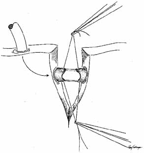 The common internal punctum should be examined carefully by passing blunt probes through this structure through each canaliculus (Fig. 42). Most patients have a true shared internal entrance of the canaliculi, but occasionally, there may be separate, but normal, internal puncta.43 Any scars or obstructions of this area must be excised with scissors, and a new common opening created by intubating the canaliculi with Silastic material (Fig. 43).