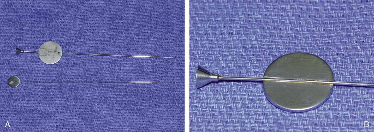 FIXATION OF TUBING. Monocanalicular stents are easy to fix in place. Once placed, the tubing has a collarette with a punctal anchor on the proximal end that nicely seats itself in the puncta similar to a punctal plug. The collarette has two components: a flat surface that lies on the lid margin, and a small bump under the plate, that anchors into the puncta (Fig. 27A and 27B). The colarette comes in two sizes, 3 mm and 4 mm. We prefer the smaller 3-mm–sized stents for use in infants and toddlers.72 For adolescents and adults, we recommend using the 4-mm–sized tubes. The stent is placed over a Ritleng probe as previously described. Of note, the difficulty with these tubes is not fixation but rather the passage through the nasolacrimal system. Once the stent is in place, a small punctal plug seating device is inserted into a small hole in the anchoring plate. The surgeon can facilitate seating the stent by simultaneously pulling the distal prolene potion and pushing the anchor with the seating device. A small pop is felt when then anchor locks into the punctum. If the punctal plug seating device is not available, a number 0000 Bowman probe or a fine tip punctal dilator can be used instead.