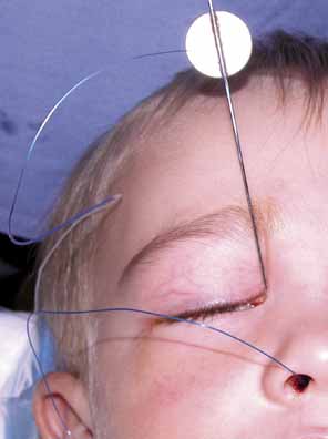 dacryocystitis. DACRYOSTENOSIS AND OTHER LOWER SYSTEM BLOCKS Dacryostenosis may be defined as a partial or complete block in the nasolacrimal duct. The most common cause of this problem is the failure of canalization of the duct at the mucosal entrance to the inferior meatus of the nose, the valve of Hasner. Although, complete osseous obstruction can occur, especially in association with anomalous passages, relative narrowing causing decreased tear flow is a more common occurrence.19–22 Abnormalities within the nasal passages, such as deviation of the nasal septum or impaction of the inferior turbinate on the valve of Hasner, also may contribute to the obstruction of the duct.23 Examination of the nasal anatomy and a working association with an otolaryngologist are both useful. Dacryostenosis should be managed conservatively whenever possible.24,25 The traditional approach has been to combine massage of the nasolacrimal sac and duct with topical instillation of an antibiotic.20,26 Parents must be carefully instructed as to how to perform lacrimal sac massage properly.22,27 The parent should be shown how to slide the fingertip in an inferior direction, placing moderate pressure over the sac and duct, and using the antibiotic ointment as a lubricant. This motion should be demonstrated on the parent's own face as well as on the child. Some physicians prefer using the antibiotic drop because there is some thought that slowly dissolving ointment bases in the nasolacrimal duct may in fact contribute to obstruction. However, the ointment form can be used if it is more acceptable to the infant. We usually recommend an antibiotic ointment for massage, which also can act as a lubricant. If crusting and discharge are present, the antibiotic ointment can be applied several times daily to the conjunctival cul-de-sac. Medical management is utilized until age 1 at which point surgical intervention is undertaken. Probing and irrigation is the main treatment. When this fails, Silastic intubation or balloon dacyroplasty may be used. If this fails, a dacryocystorhinostomy is the ultimate management. These procedures are discussed further later in this chapter. PUNCTAL VEILS AND ATRESIA Children with congenital epiphora may lack a patent opening into the lacrimal system. An astute physician may be able to discover the lack of a punctum in the office. However, it is more common in children to discover punctal veil or atresia at the time of probing surgery. When approaching these cases, careful inspection of the puncta using magnification is most helpful. In the setting of a veil, the punctum grossly appears normal, a punctal dilator or probe will not enter the system because a membrane covers this opening. A safety pin or sharp dilator can be used to “pop” into the system. In punctal atresia, the subtle elevation of the puncta on the lid margin is absent. On close inspection, there is no obvious opening to be found. Absence of a punctum often indicates absence of the canaliculus as well. Thus, a cut-down may or may not be helpful. If one punctum is patent it is best to leave the system alone. If both puncta on a given side are missing, a cut-down procedure in the area of the canaliculus or retrograde dissection from the lacrimal sac can be attempted. A conjunctivodacryocystorhinostomy may ultimately be required. CONGENITAL LACRIMAL FISTULAS A congenital lacrimal fistula is most likely the result of canalization of a portion of epithelial cord that extends from the lacrimal sac to the surface of the skin. Most fistulae originate from the lacrimal sac, but some originate from the common canaliculus or nasolacrimal duct. Simple excision of the fistulous tract has been successful in most cases.28 Other authors have recommended cautery of the fistula and excision of the fistula with dacryocystorhinostomy (DCR). Recommendations have also included DCR with common canalicular dissection, fistula excision, and canalicular intubation in certain situations.29,30 MUCOCELES (AMNIOTOCELES) Most of the time it is not necessary to perform probing surgery before 1 year of age. One exception is a congenital mucocele, or amniotocele.31 This term refers to a sterile accumulation of mucus or possibly amniotic fluid trapped in the nasolacrimal sac due to a one-way valve effect at the end of the nasolacrimal duct. Fluid can enter the sac, but with poor exit of accumulated fluid, the dilated sac is seen as a bluish mass inferior to the medial canthal tendon. This swelling frequently is misdiagnosed as a hemangioma.19 In cases of congenital dacryocele without signs of infection, one approach is to massage the lacrimal sac in an attempt to open the obstruction. Massaging too vigorously, however, may rupture the dilated lacrimal sac and may consequently cause an orbital cellulitis. Parenteral antibiotic therapy and management similar to an acute dacryocystitis may ultimately be required. NEONATAL DACRYOCYSTITIS Acute dacryocystitis of the newborn is an indication for office or bedside probing of the nasolacrimal duct (Fig. 3).19,26,32 In this instance, there are other signs of inflammation, and there also may be associated fever and an elevated white blood cell count. The lacrimal sac can be tapped with a turberculin needle and syringe (Fig. 4)33 to create a fine opening that will not fistulize, as can occur with a knife incision, and allows smears to be taken immediately for early diagnosis. Likewise, material for culture and sensitivity can be obtained so that specific antibiotics can be identified. Decompression of the sac is achieved immediately, which gives relief of symptoms. Furthermore, with the needle in position, the syringe can be changed to instill 0.5 mL of a bactericidal antibiotic drop. A broad-spectrum antibiotic is given intravenously until a more specific antibiotic can be identified by the cultures and sensitivities obtained from the tap. After several days, when the acute inflammation subsides, bedside probin