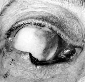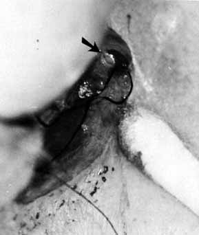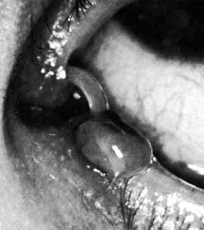 For bicanalicular stent fixation, in order to prevent these complications, we prefer to pass each probe through a small piece of scleral buckle sponge and then to tie square knots to secure the stent in the appropriate position.75 The size of the loop is an important factor. It is important to allow for 2 to 3 mm of lateral motion of the loop at the medial canthus when it is pulled with a muscle hook after the sponge is positioned properly underneath the inferior turbinate posteriorly. After the probes are slipped through the sponge, they are removed, and multiple surgical knots are tied so that the sponge cannot slip off of the ends of the Silastic tubing. The ends should be cut so that they are not visible externally. An alternative method is to secure the loop of Silastic inside the nares with a 5–0 prolene suture again with the appropriate amount of tension on the Silastic. POSTOPERATIVE MANAGEMENT. The postoperative management after Silastic intubation of the nasolacrimal duct requires regular follow-up. There is little maintenance required in these patients, but they should be monitored for potential problems. With the use of monocanalicular stents, there is minimal concern. The two problems in our experience with the monocanalicular system are spontaneous extrusion in approximately 10% of patients and corneal/conjuctival abrasions in less than 5%. In patients with bicanalicular stents, they should be watched for cheesewiring, or the slitting of the canaliculi and puncta (Fig. 32). This condition can occur if the loop is tied too tightly and is also because of the rapid growth of young children. The loop has a fixed length, so slitting of the canaliculi may occur as the face enlarges. A slit of up to one half of the canalicular length does not seem to cause any problems in the otherwise normal canaliculus, but nevertheless, it is a complication that should be avoided if possible. The loop should be tied loosely enough to allow for some growth, but not too loosely such that the cornea could be irritated on adduction of the globe. Another complication of Silastic intubation is the formation of a granuloma of the punctum or canaliculus (Fig. 33). This problem can be corrected by simple excision of the granuloma and cautery of the base.
