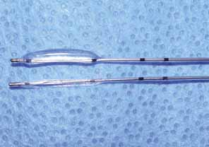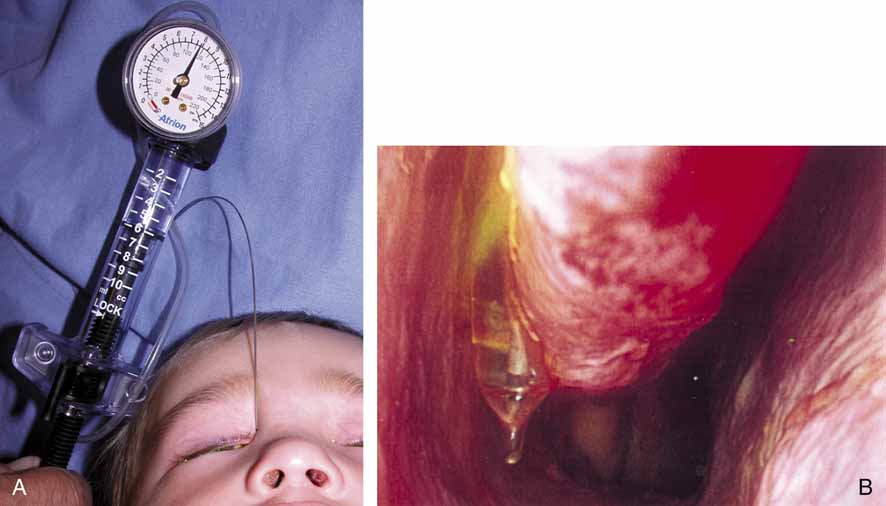 Silastic intubation of the nasolacrimal system is done as an outpatient day-surgery procedure. Patients or their parents should be cautioned about postoperative bleeding from the nose. Frank hemorrhage is uncommon but serious in a young child because of a relatively small total blood volume. Afrin nasal spray, cold compresses, elevation of the head in bed, and nasal packing can be used if necessary. If the hemorrhage persists, thrombin in gelfoam or bipolar cautery may be required. Hospitalization and possible assistance from an otorhinolaryngologist may also be necessary. Fortunately, significant hemorrhage is a rare complication. After Silastic intubation, the patient is routinely given an antibiotic ointment such as polysporin or a combination antibiotic–steroid eye drop to be used two to four times daily. Patients should be seen several weeks postoperatively if there are no unusual problems. Continued follow-up every 2 to 3 months is required while the tubing is in place. REMOVAL OF TUBING. The time of tubing removal has increased from the original 6-week concept to 6 months for children younger than 2 years, and up to 1 year for older children.63,64,66 This timing allows the duct and its mucosal lining to respond to the stent. This concept of a response is important; especially in a young child, rapid growth is occurring, and in the same way that it is possible to expand a microphthalmic orbit with tiny lid fissures with the use of increasingly larger conformers, it is possible to expand the nasolacrimal duct with the Silastic stent during the growth period. Removal of the monocanalicular stent is done in the office. Adult patients will easily tolerate the removal, which is like placing a punctal plug. Children can also tolerate the removal with the parent's assistance. The child is held on the parent's lap and topical anesthetic is placed in the cul-de-sac. Then with the parent holding the child still, a Castroviejo needle holder is used to grab the flat plate portion of the stent (anchor) out of the punctum. If done quickly, the stent removal can be atraumatic. Removal of the bicanalicular tubing usually requires general anesthesia by face mask or laryngeal mask in children. Occasionally, in a very cooperative child, removal can be done as an office procedure that is similar to removal of tubing in the adult. Visualization of the inferior meatus through a nasal speculum is aided by the use of 4% cocaine or Afrin spray to shrink the nasal mucosa. Blowing the nose in the office and suctioning in the operating room also may be helpful in placing the tubing in an anterior location for removal. The loop is cut with a scissors in the medial canthal area after a topical anesthetic is instilled. The ends of the Silastic tubing are grasped with a hemostat or small needle holder and pulled from the inferior meatus. A fiber-optic head lamp or indirect ophthalmoscope is useful. The major advantage of the monocanalicular tube system over the bicanalicular systems is the ease of tubing removal in the office. Balloon Dacryoplasty Balloon dacryoplasty was initially developed from angioplasty technology.77 Subsequently, a lacrimal catheter was introduced to the market and its efficacy has been proven by several groups in both children and adults.71,78,79 This technique utilizes a 2- or 3-mm diameter balloon inflated to 8 atmospheres of pressure to dilate strictures or partial obstructions in the nasolacrimal duct (Fig. 34). Balloon dacryoplasty is typically reserved for nasolacrimal obstruction refractory to probing. Although some surgeons utilize this procedure on as a primary probing technique in children, we typically reserve it for patients who have persistent nasolacrimal duct obstruction after primary probing and irrigation.