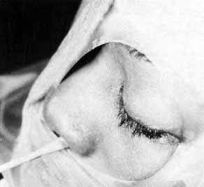 Postoperative management of the Pyrex tube is difficult in the pediatric age group but not impossible. Topical antibiotic drops are used four times per day for 2 weeks. In an adult, periodic syringing is easily done as an office procedure. In the pediatric age group, however, examination under anesthesia may be required to syringe adequately through mucus obstructions. The use of a contact lens wetting solution once daily is helpful in both pediatric and adult patients to reduce mucus formation. It is also helpful to instruct the patient to do the Valsalva maneuver by a quick inspiration with closure of the mouth and pinching both nostrils. In some instances, 10% N-acetylcysteine drops can be given several times daily. The mucolytic action of this agent sometimes will clear the tube. It is not harmful to the globe or adnexae, and obviously should be tried in the pediatric age group before subjecting a child to a general anesthetic. Patients should be instructed to close their eyes or hold a finger over the medial canthal region when they sneeze or blow their nose. Otherwise, the tube can dislodge, even when secured with a suture. If a tube is lost, it should be replaced as soon as possible. The channel can be dilated with gold dilators (Weiss, Gunther Weiss), and a new tube of appropriate length slipped in over a probe. A suture can be used for fixation, as previously described. ABNORMALITIES OF THE LACRIMAL SAC Early probing for mucoceles (amniotoceles) and for neonatal dacryocystitis was discussed earlier. These entities usually are seen at birth or in the immediate postpartum period.33,110 The anlage or supernumerary duct (Fig. 58) is another congenital abnormality of the sac. With a supernumery duct, tears drain directly onto the face if the upper portion of the nasolacrimal system is open. Repair of a supernumerary duct can be accomplished by first injecting a small amount of methylene blue through a lacrimal cannula into the duct to outline the mucosal lining down to the lacrimal sac. An appropriately sized probe is placed into the supernumerary duct. An ellipse of skin is resected conservatively around the probe. The duct is traced down to the lacrimal sac, where it is ligated and cut (Fig. 59). A layered closure of muscle and skin is done. This type of simple closure will prove to be sufficient if there is no lower block to tear flow in the nasolacrimal duct. If there is a lower system block, however, Silastic intubation of the nasal duct or DCR will be required to eliminate this problem.