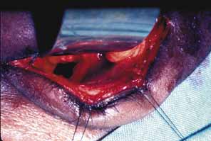 compromise remains imminent in spite of the other interventions. Lateral canthotomy and cantholysis can be performed in a treatment room. Local anesthesia of 2% xylocaine with 1:100,000 epinephrine is injected in the lateral canthal area. The proposed incision extends horizontally from the lateral canthal angle, beyond the lateral fornix, to the level of the lateral orbital rim. This can be performed with a Stevens scissors alone, or, if cautery is not readily available, a straight clamp can be positioned in the proposed area and clamped for 10 seconds to provide hemostasis prior to making the incision with the scissors. Often this maneuver allows enough widening of the palpebral fissure to relieve orbital pressure. When this maneuver alone is ineffective, a lateral cantholysis is performed by positioning the Stevens scissors perpendicular to the canthotomy incision and releasing the lateral canthal ligament fibers in the lateral aspect of the upper and lower lids along their attachments to the rim (Fig. 4).28 Additional decompression of the orbit rarely becomes necessary and would best be managed under general anesthesia with the intent to explore the orbit for the mechanism of active bleeding with possible bony decompression of the lateral wall.