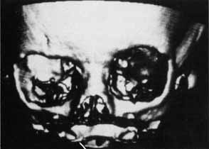 Naso–orbital–ethmoidal fractures involve the nasal bones, ethmoid sinuses, and medial orbital wall. These comminuted fractures may be characterized by collapse of the sinuses and flattening and widening of the nasal bridge, with lateralization of the medial canthi, enophthalmos, and medial rectus entrapment. The assessment of bony relationships of such complex fractures can be facilitated by three-dimensional reconstructions of conventional CT scans (Fig. 16).