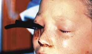 The indications for repair and the method of fixation vary widely and are reviewed elsewhere.62,63 Treatment algorithms consider the extent of fracture and degree of displacement. The orbital floor can be exposed through a subciliary or transconjunctival incision, and the medial orbital wall from a bicoronal approach to perform open reduction and rigid internal fixation with miniplates63 or microplates.64–66 The lacrimal canaliculi are located immediately posterior to the medial canthal ligament. In most cases, they join to form the common canaliculus, which opens into the lacrimal sac. The sac is situated in the lacrimal fossa and extends inferiorly through a narrow bony canal that comprises the frontal process of the maxilla and the lacrimal bone. Naso–orbital–ethmoidal, maxillary, LeFort, and complex inferior orbital rim fractures cause comminution and displacement of bone fragments that have the potential to affect the course of the lacrimal system. The prevalence of posttraumatic nasolacrimal obstruction is 17.4%67 to 25%68 in mid-face trauma. To address this potential problem, some surgeons advocate acute intubation of the lacrimal system with silicone tubes when there is radiographic or intraoperative evidence of damage to the lacrimal sac or canal.69 Others argue that the development of posttraumatic nasolacrimal obstruction is not inevitable, and during repair of a mid-facial injury, it may be difficult to determine whether the lacrimal system is blocked secondary to shifted bone, hemorrhage, edema, or actual laceration. Moreover, silicone intubation is not a benign procedure. Latrogenic stricture or laceration of the lacrimal system may result from excessive manipulation during probing. False passages may result from probing through edematous or friable traumatized tissues.70 We recommend later repair of nasolacrimal obstruction if tearing or dacryocystitis develops after repair of the mid-facial fractures. Punctal stenosis with a patent nasolacrimal duct may be ameliorated successfully with silicone tubes. |