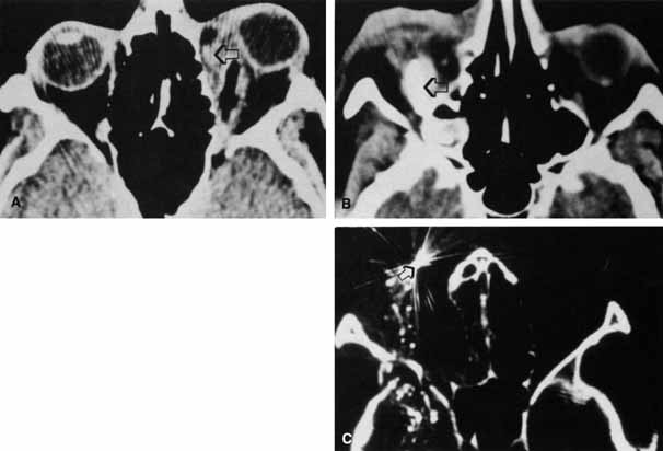 and at the workplace in working-age men.72 The diagnosis of orbital foreign bodies may be elusive, and clinical signs often are minimal. A detailed history about the circumstances of the injury is important, and it is especially important to suspect the diagnosis. Often, the clinical signs appear trivial. Reconstructing the circumstances of the injury may provide information about the foreign material and size of the body. The relative velocity of the object may help to predict the extent of the injury. Small objects traveling at high speeds are more likely to penetrate the globe before entering the orbit, whereas objects of slower velocity, such as sticks or twigs, are more likely to spare the globe (Fig. 17).21