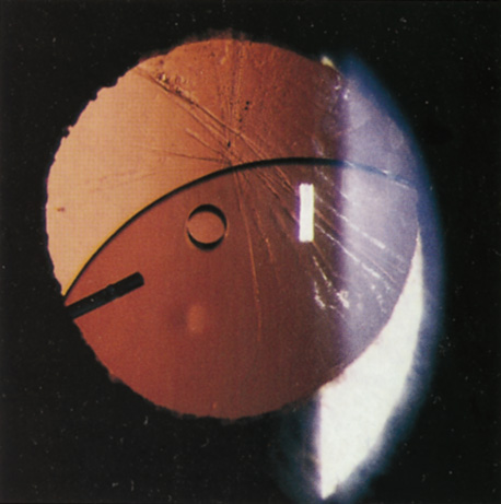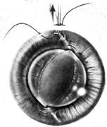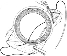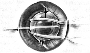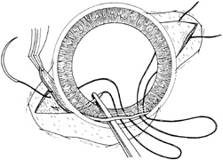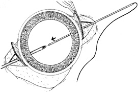 Next, for fixation of the proximal haptic, the needle of a single-armed CTC-6L suture is passed through a paracentesis located about 150 degrees away from the center of the wound. This needle is directed through the pupil, under the iris, and out through the posterior scleral lip of the wound 180 degrees away from the midpoint of the previous suture (Fig. 25). A radial keratotomy marker may be used to more accurately place the suture passes 180 degrees apart. The free end of this suture is retrieved from the pupillary space and brought through the wound with a microhook. Then it is securely tied to the inner aspect of the eyelet in the proximal lens haptic, ensuring that it is not entangled with the two previously placed distal sutures. Care is taken to position the sutures symmetrically on either the upper or lower side of the haptics, thus minimizing torquing and tilting of the lens optic.