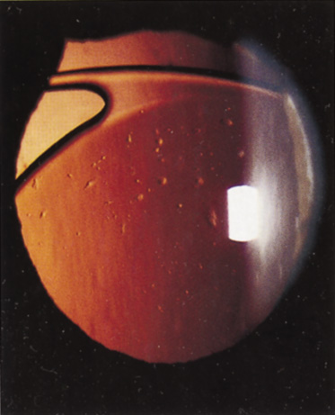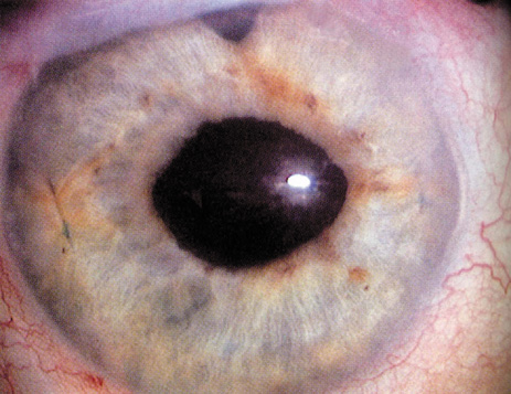 would be required for PC IOL insertion, particularly if suture fixated. Older anterior chamber lens designs have a problematic track record, however. The original rigid designs and second-generation, flexible, closed-loop haptic designs caused many complications, including erosion into the angle; pain; corneal edema (see Fig. 1); iris/pupil distortion; PAS; uveitis, glaucoma, and hyphema (UGH) syndrome; CME; RD; and endophthalmitis.7–32 Therefore, these designs have since been replaced by lenses with flexible, open-loop haptics (i.e., Kelman multiflex style) that have proved to be safer and have produced better long-term visual outcomes.33–37 However, if used incorrectly, the multiflex AC IOL designs also may cause some of the complications associated with the older AC IOL designs (Figs. 8 and 9).128 Despite the flexibility of the multiflex haptics, lens sizing is critical for safe AC IOL implantation. Many surgeons use the rule of measuring the horizontal “white-to-white plus one” millimeter to determine overall AC IOL diameter. Although valuable as a starting point, this is only an approximation, and lens size can be assessed only after implantation. Indeed, a recent study suggests that the horizontal white-to-white measurement is not correlated with AC diameter.129 A lens that is too large or implanted in the iris root may cause ocular discomfort, angle erosion, iris distortion (Fig. 10), PAS, and iritis. A lens that is too small will not fixate and may either “propeller” in the eye or rock back and forth like an upside-down pendulum, predisposing the patient to progressive endothelial cell loss, uveitis, hyphema, and CME.