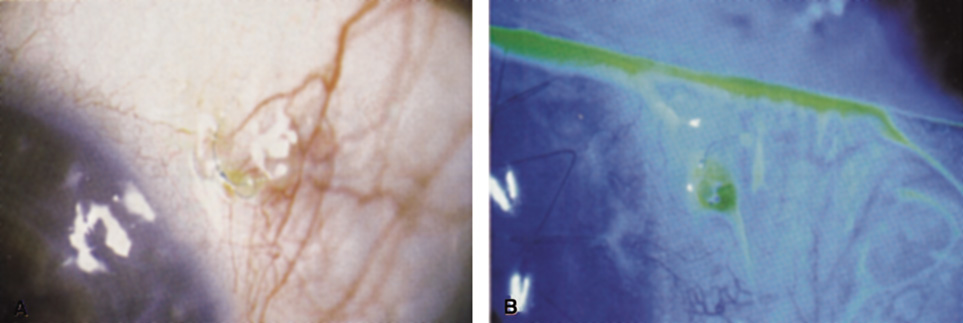 the incidence and types of complications. In the 1980s, a number of authors reported their experiences with secondary anterior chamber lens implants. In a review of the pooled literature, including 2,142 cases, Lindstrom and Harris32 found the incidence of various complications to be as great as 19.8% for CME, 10.8% for hyphema, 8% for secondary glaucoma, 5.4% for corneal edema, 3.3% for uveitis, and 1.6% for retinal detachment. In their personal experience with 153 cases, the incidences of the same sequelae were 4.6%, 0.7%, 3.9%, 2%, 2.6%, and 1.3%, respectively, with 81.6% of patients attaining visual acuity of 20/40 or better and 8.5% losing two or more lines of BSCVA. Depending on the study, as many as 94% of eyes achieved better than 20/40 vision, and the loss of more than two lines of BSCVA ranged from 3% to 10%.32,33,136–138 However, these reports antedated the availability of multiflex-style anterior chamber IOLs and sutured posterior chamber IOLs. The roles of vitreous loss and vitrectomy and their relationships to the development of CME and RD during the implantation of secondary AC IOLs is controversial. Cozean138 suggested that there is a correlation between CME and disruption of the vitreous. Shammas and Milkie51 also noted this relationship and stated that the incidence of CME increases if the secondary IOL implantation is performed within 1 year of intracapsular cataract extraction, the preoperative fluorescein angiogram is positive for CME, or there is vitreous loss. Kraff and colleagues139 reported that vitrectomy may increase the risk of RD. Wong and colleagues7 also suggested that vitrectomy might increase the chance of RD (their rate was 4%), but might lower the risk of CME, which they found to be 3%. Not surprisingly, this study also found a higher incidence of these problems in eyes with closed-loop anterior chamber as opposed to sulcus-placed posterior chamber lenses. Conversely, Lyle and Jin30 reported similar incidences of CME (6%) when comparing eyes that received an AC IOL or PC IOL (68% had scleral suture fixation), but the rate of RD was higher in the latter group (0.8% for AC IOL versus 3.5% for PC IOL). Posterior vitreous detachment and vitreous liquefaction occurs in most aphakic eyes within 1 year postoperatively;140 this may suggest an explanation for the decreased RD rate when secondary IOL insertion is performed after 1 year.42,43 In studies of sulcus-sutured PC IOLs, results are comparable to contemporary studies of AC IOLs (as noted earlier). In Gess' original description,64 92% of the 303 eyes achieved better than 20/40 visual acuity. Loss of more than two lines of BSCVA has been reported to occur in 2.4% to 6.2% of eyes.102,120,141 The most common complication is suture erosion (see Fig. 5),85,98,120 which in Solomon's series occurred in 73% of cases, even with the use of scleral flaps. We have not seen any suture erosion when the polypropylene knots are either rotated and buried into sclera or covered by a thick scleral flap in the entrance wound, as described earlier. If suture erosion does occur, this problem can be treated in several ways, including cutting the free ends flush on the knot, cauterizing the knot, revising the scleral flap, or using a scleral patch graft.98 A number of cases have been reported in which the sutures were removed, either to treat suture erosion or inadvertently.98,141,142 As a general rule, this is not recommended as lens decentration or dislocation can result, because there may be little or no fibrosis of the lens haptic to uveal tissue.111 According to the literature, only in rare cases have transsclerally sulcus–sutured lenses remained stable after suture removal.141,142 If the eroding suture is obviously loose and there is no pseudophakodonesis, it may be safe to cut the suture without producing lens dislocation. In each instance, patients are warned of risks and alternative options, instructed not to rub or bump their eyes, and advised of the symptoms of lens dislocation. Glaucoma and RD have been described in as many as 19% and 5.4% of eyes receiving sutured PC IOLs, respectively.143 The reported incidence of new CME has ranged from 0%98 to 18% in patients receiving a transsclerally sulcus-sutured PC IOL.120 Price and Wellemeyer found hyphema and/or vitreous hemorrhage in 13% of eyes, although Bleckmann and Kaczmarek144 reported hyphema in 16.7% and vitreous hemorrhage in 25% of patients in their series. Other studies, however, state much lower incidences of intraocular bleeding, such as Helal's group,102 which had a 4.9% rate of hyphema. Lens tilt and decentration are potential complications that may occur in as many as 10% of cases with transsclerally sulcus–sutured PC IOLs (see Fig. 4).98 Lens tilt occurs because of the torque created by asymmetric suture placement on the IOL. Teichmann87 studied the combinations of suture configurations and found that only four were torque free. He recommended looping the sutures symmetrically through the opposing eyelets. Theoretically, tilt also can be eliminated with radial suture placement, but this is anatomically undesirable, because one of the sutures will exit through the ciliary body. In Sharpe's study of children,71 an IOL tilt of 15 degrees in one case produced 6.5 D of cylinder. A decentered sutured PC IOL may result from a number of factors. These include asymmetric attachment of the sutures to the haptics; failure to place the needles through the sclera 180 degrees apart; and suture loosening, breakage, or slippage on the haptics. Therefore, to prevent lens malposition, it is important to use an IOL with eyelets on the haptics, symmetrically secure the sutures to the eyelet, and place the needle passes an equal distance from the limbus and exactly 180 degrees apart. Fortunately, small degrees of lens tilt (less than 10 degrees) and decentration (less than 2 mm) are asymptomatic and clinically insignificant.88,144 The majority of studies that have directl