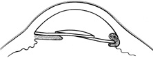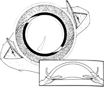 The sutures are then secured. For the leading haptic, this is accomplished by cutting off the needles and tying the suture ends together, cutting the suture close to the knot, and burying the knot by rotating it into the sclera. We prefer to use a Dangel (slip) knot135 because it is more compact and thus easier to bury than the conventional surgeon's knot. The proximal suture, which is still attached to its needle, is pulled up, and a partial-thickness scleral bite is taken in the posterior bed of the incision. The suture is tied to itself and then trimmed. This knot is covered by sclera and thus effectively buried when the wound is closed in a watertight fashion (Fig. 27). The conjunctiva is reapposed and, depending on the surgeon's preference, subconjunctival corticosteroids and antibiotics may be injected.