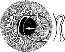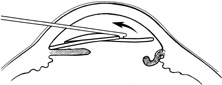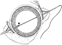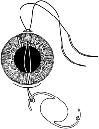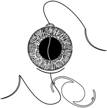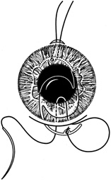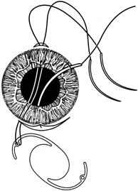 the optic and gently lifting it anteriorly. For eyes with minimal or no capsular remnants, iris capture can be safely achieved in a single maneuver with a foldable acrylic lens.60,61 An AcrySof lens is folded in the “bucket-handle” or “mustache” configuration (across the 3 to 9 o'clock meridian), inserted into the anterior chamber so that the optic is above the iris and the haptics are directed below the pupil, and unfolded over a spatula (inserted through a paracentesis incision opposite the wound) to prevent the optic from slipping into the posterior chamber (Fig. 17). When the IOL is in the correct position, two McCannel style sutures are used to fixate the haptics to the peripheral iris. A 9-0 or 10-0 polypropylene (Prolene) suture on a curved needle (Ethicon CIF-4 or CTC-6) is passed perpendicular to the haptic from a peripheral corneal site (with or without a paracentesis) into the anterior chamber, down through the iris, underneath the haptic, then back up through the iris, and finally through the peripheral cornea, where it is withdrawn from the eye (Fig. 18). Maneuvering the needle inside the eye sometimes proves challenging. If a needle exit paracentesis is used, a cannula can be placed through this paracentesis, and can aid in retrieving the needle by docking it. The suture tail is then cut off, leaving a 30-mm piece of polypropylene.