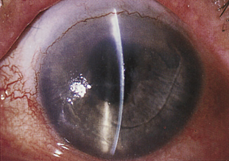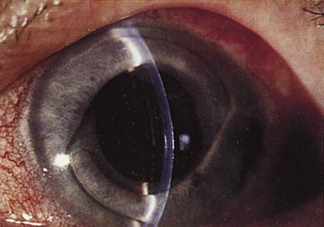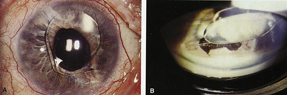 or poor motivation for proper use. For patients unable to use these devices, various surgical procedures have been investigated, including secondary IOL implantation, epikeratophakia,1 and intracorneal implants.2 The major concern with all of these approaches is the risk of vision-threatening complications. Epikeratophakia and corneal inlays produced disappointing results because of irregular corneal surface changes and poor refractive predictability.3–6 Early results of secondary IOL implantation were mixed. Several reports documented excellent outcomes after secondary posterior chamber intraocular lens (PC IOL) implantation in patients with intact posterior capsules.7 Good short-term results were initially reported with early closed-loop anterior chamber intraocular lenses (AC IOLs), but unfortunately, numerous complications, including uveitis, glaucoma, hyphema, cystoid macular edema, endothelial cell loss, and corneal decompensation (Fig. 1), later developed in many eyes receiving lenses of this type.7–32 The newer, open-loop, one-piece flexible design (i.e., Kelman multiflex style) has eliminated nearly all of these complications, and, as a result, has gained growing acceptance.33–37 As an alternative option for eyes without sufficient capsular support, various lenses and surgical techniques have been developed for implanting iris-supported (e.g., lobster-claw lens)38–44 and sulcus-sutured posterior chamber lenses.