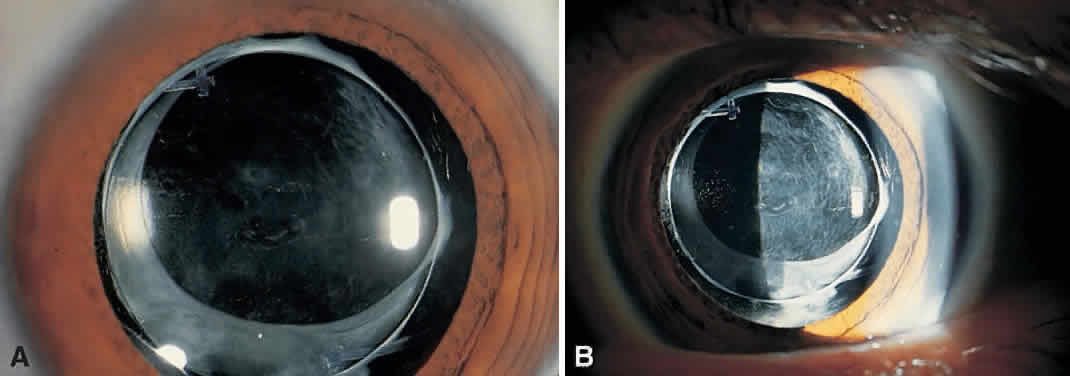 that may limit posterior capsular opacification. Hollick and associates evaluated the effect of capsulorrhexis size on PCO.27 A small capsulorrhexis with the anterior capsule covering the optic was performed in one group of patients and compared with a second group with a larger capsulorrhexis that extended past the edge of the IOL optic. Both groups were implanted with 5.5-mm optic polymethylmethacrylate (PMMA) lenses. The presence of a large capsulorrhexis was associated with a significant increase in posterior capsular wrinkling and opacification. Eyes in which the capsulorrhexis did not extend past the edge of the optic had a better visual acuity at 1 year. Recent attention has focused on the material and design of the IOL. Inhibition of PCO involves the presence of the IOL in the capsule, obliteration of the space between the posterior side of the optic and the capsule, and the adhesiveness of the IOL.28 Nishi compared 225 eyes implanted with a PCIOL with 379 eyes that remained aphakic.23 The incidence of PCO was significantly less in the eyes implanted with a PCIOL suggesting that an IOL has suppressive effects on the migration of lens epithelial cells toward the center of the capsule. Hollick and associates concentrated on the IOL material and randomized 93 patients to receive either PMMA, silicone, or hydrogel lenses.29 At 2 years after surgery, hydrogel IOLs induced the greatest mean percentage area of posterior capsular opacification followed by PMMA and then silicone lenses. YAG laser capsulotomy was performed in 28% of eyes with hydrogel lenses and 14% of eyes with PMMA lenses at 2 years. No eyes randomized to silicone lens implantation required YAG laser capsulotomy. Polyacrylic lenses have demonstrated even lower rates of PCO.21,30 The presence of lens epithelial cells was significantly lower with the polyacrylic lens compared with PMMA and silicone lenses. Regression of epithelial cells was observed in 83% of the acrylic lenses with regression occurring in less than 20% of eyes with the PMMA and silicone lenses.21 YAG posterior capsulotomy was not required in any of the eyes implanted with the acrylic lenses.30 The design of the polyacrylic IOL appears to decrease PCO. Polyacrylic lenses have a tacky surface that create adhesion between the IOL and lens capsule. This ablates the space posterior to the IOL causing compression of lens epithelial cells and preventing further migration of lens cells behind the IOL. This has been called the “no space, no cell” theory. Hollick and colleagues suggested that the adhesion formed with a polyacrylic lens takes a few weeks to form during which some lens epithelial cell migration my occur.21 This would explain the regression of PCO that is observed in the poly-acrylic IOL. PCIOLs designed to hold the capsule away from the lens surface to facilitate YAG capsulotomy provide less inhibition to lens epithelial cell migration. Posterior-convex or biconvex lenses with edged optics bring the capsule into contact with the posterior surface of the optic inhibiting cell migration and PCO. The edged optic design also forms a barrier against the remaining lens cells. The use of posterior-convex and biconvex optics reduced the rate of YAG laser capsulotomy after cataract surgery to 6.5% after 5 years compared with a rate of 40.0% at 5 years with a convex-plano optic.31 Further research has investigated the design of IOL haptics in preventing lens epithelial cell migration. In vivo animal studies where a sharp, discontinuous bend in the posterior capsule was created with a capsule-bending haptic or a capsule-bending ring significantly inhibited lens epithelial cell migration. Lens epithelial cells accumulated at the equator of the capsule around the haptic ring with less PCO.28 |