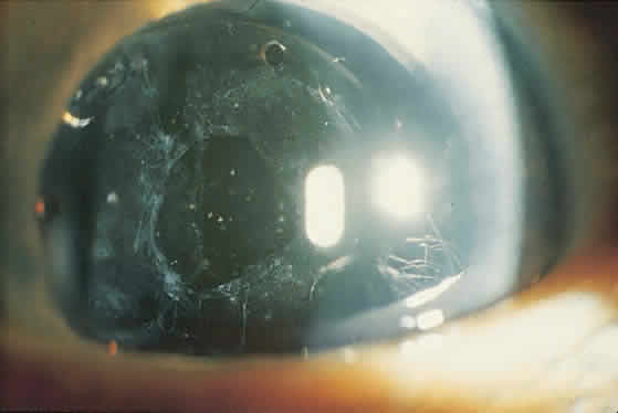 Most YAG capsulotomies are uncomplicated; an opening in the capsule is successfully created in 98% of cases.11 Visual acuity improves almost immediately following treatment. The eye may be treated before or after the procedure with apraclonidine 1% to blunt a potential rise in IOP, which is measured 20 to 60 minutes later. Persistent elevation of IOP occurs infrequently and is typically treated with an ocular hypotensive agent and close observation. Corticosteroid eye drops three or four times daily (e.g., fluorometholone acetate or prednisolone acetate 1%) for 4 to 7 days is a management option used by some ophthalmologists. Generally, patients experience only minimal symptoms, if any, after this procedure. Follow-up typically occurs in 1 week, unless the IOP is significantly elevated on post-YAG testing. Long-term follow-up is required in eyes with persistently elevated IOP.12 COMPLICATIONS Although Nd:YAG laser posterior capsulotomy is a relatively straightforward procedure, complications may be encountered. The most common intraoperative complication reported in a cohort of 2110 patients followed by the Food and Drug Administration (FDA) was damage to the IOL.11 Accurate focusing of the helium-neon beam on the posterior capsule prevents the occurrence of this event. However, postoperative contraction of the capsular bag can move it into very close proximity to the posterior surface of the IOL, leading to this complication. Other factors that increase the likelihood of IOL damage include increased thickness of the PCO membrane and the total laser power used. Despite the occasional creation of laser-induced pits in the IOL, these typically do not cause visual disturbances. Rupture of the anterior hyaloid face was the second most frequently reported complication occurring in 19% of the patients observed during the FDA study. Less frequently encountered intraoperative complications were bleeding in 1.0%, corneal edema in 0.3%, and iris damage in 0.4% of cases.11 Elevation of IOP after Nd:YAG capsulotomy is the major postoperative complication encountered that requires treatment.11,13–15 The cause of this elevation is not certain but may be related to the release of lens epithelial cells into the anterior chamber. Variables such as the total energy delivered, number of laser pulses, size of the capsulot-omy, iris bleeding, and the amount of inflammation do not appear to affect IOP.14–16 However, some authors dispute this and assert that higher IOP after Nd:YAG capsulotomy is associated with larger capsulotomies and increased energy.12,13 In an FDA cohort of 213 patients following a protocol of measuring postprocedure IOP at selected intervals, 39% of patients had an increase of 5 mmHg or more in IOP 2 to 6 hours after laser capsulot-omy. About 28% experienced an increase in absolute IOP of more than 30 mm Hg. None of the eyes received prophylactic ocular hypotensive agents in the perioperative period.11 The maximum elevation of IOP occurred between 1.5 and 4 hours after laser treatment. Of these eyes, 60% returned to an IOP of less than 22 mmHg by 24 hours with 90% of eyes achieving normalization of IOP by 1 week.11 Results by Slomovic and Parrish15 mirrored the FDA's findings. Thus, 64% of eyes developed a maximum IOP rise by the second postoperative hour with 41% of eyes developing an IOP greater than 30 mm Hg. The results of the study of Slomovic and Parrish indicated that glaucomatous eyes, which were either medically or surgically controlled prior to capsulotomy, had a lower mean IOP rise after laser capsulotomy compared with eyes that had not been prophylactically treated. With the discovery that pretreatment may blunt the postprocedure elevation in IOP, a prospective multicentered trial was initiated to evaluate the effect of apraclonidine applied in the perioperative period to treated eyes versus placebo. Apraclonidine 1% was administered 1 hour before and immediately after performing YAG laser capsulotomy.17 Placebo-treated eyes experienced a maximum IOP elevation of 4.4 mm Hg 3 hours after treatment. The IOP in apraclonidine-treated eyes decreased 2.8 mm Hg from baseline. As a result of the findings, eyes are now typically treated with apraclonidine or brimonidine when performing YAG laser capsulotomy. Ge and colleagues12 evaluated long-term IOP fluctuations in eyes followed for a median of 1.5 years after YAG posterior capsulotomy. Eligible patients were pseudophakic bilaterally with one eye receiving laser capsulotomy and the other eye serving as a control. All eyes received apraclonidine before and after treatment. An elevated IOP mea-sured at 1 hour postprocedure was a significant risk factor for chronically increased IOP. This indicates that patients with elevated IOP after YAG laser capsulotomy despite pretreatment with ocular hypotensive agents should be monitored for persistent IOP elevation. Other less common complications include retinal detachment and cystoid macular edema. In one recent evaluation of 196 eyes examined at 1 month after laser capsulotomy, only one eye sustained a new retinal break that was not demonstrated before treatment.18 Steinert and associates16 reviewed 879 Nd:YAG laser posterior capsulotomies over a 3-year period. Cystoid macular edema developed in 1.23% and retinal detachment occurred in 0.89%. Three of eight patients developed retinal detachment more than 1 year after laser capsulotomy. The number of laser pulses and amount of total energy delivered to the eye were not identified as risk factors. The FDA report of 2110 patients registered similar numbers.11 Cystoid macular edema occurred in 1.2% of the study eyes with retinal detachment in 0.5%. Less common complications included vitritis, iritis, and retinal hemorrhage in less than 0.6% of patients.11 Case reports of delayed posterior dislocation of silicone plate-haptic lenses have been described in the literature.19 |