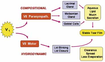 OCULAR SURFACE HEALTH IS MAINTAINED BY A STABLE TEAR FILM Anatomically, the ocular surface encompasses the entire mucosal epithelial lining bordered by the skin at the superior and inferior eyelid margins. Histologically, this epithelial surface covers two major territories (i.e., the cornea and the conjunctiva). The primary function of the ocular surface is to provide clear vision during an open-eye state. To achieve this goal while maintaining comfort and preventing microbial invasion, the ocular surface has to be covered by a stable tear film. Therefore, the mechanism by which the ocular surface health is ensured is inherently built into the relationship between ocular surface epithelia and the preocular tear film. As recently summarized,1 compositional factors including the ocular surface epithelia, meibomian glands, and lacrimal glands and hydrodynamic factors such as eyelid blinking and closure are essential to constitute ocular surface defense that governs how preocular tear film stability is maintained (Fig. 1). These two major factors are integrated via two neuronal reflex arcs, triggered by the sensory drive of the first branch of trigeminal nerve (V1), and mediated by the parasympathetic branch and the motor branch of the facial nerve (VII) as the efferent output, respectively (Fig. 2). Such a neuroanatomic integration of ocular surface defense explains how external adnexal glands and eyelids can be integrated with ocular surface epithelia as a unit to maintain a stable tear film. Based on this concept, one predicts that deficiency or alteration of any of these elements involved in such neuroanatomic integration can lead to an unstable tear film, a hallmark of various forms of dry eye.2 Therefore, investigation into dysfunction of this neuroanatomic integration is the first step toward better understanding of the pathogenesis of various ocular surface disorders, and is a prerequisite before any ocular surface reconstruction. |