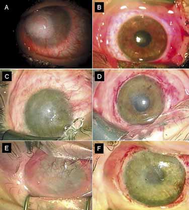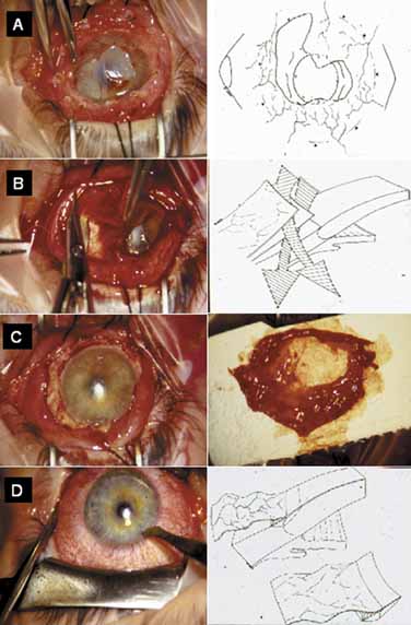 The surgical procedure of KLAL is schematically depicted in Figure 10 (To view surgical video, please contact Dr. Tseng at stseng@ocularsurface.com). It should be noted that after the pannus is removed, the remaining corneal stroma is frequently clear especially in those eyes without ulceration and endothelial dysfunction (Fig. 11), resulting in significant improvement of vision without corneal transplantation. Nevertheless, if the remaining corneal stroma still has a deep scar, visual rehabilitation will require additional corneal transplantation (Fig. 12). If corneal transplantation will have to be performed, it is best to do so as a separate procedure 3 or 4 months later when the eye is not as inflamed (Fig. 12) because there is a high rejection rate for corneal transplants when combined with KLAL at the same setting.35,36,42,45 To avoid this complication, another solution is to perform deep lamellar keratoplasty rather than penetrating keratoplasty especially if there is no corneal endothelial dysfunction.