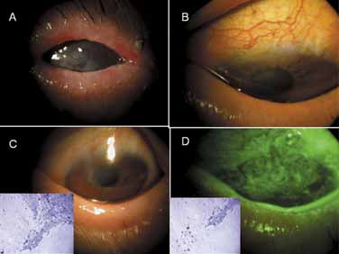 loss of limbal Vogt's palisades under slit-lamp examination10 and by occurrence of late fluorescein staining,11 reflecting poor epithelial barrier function.12 However, the definitive diagnosis of conjunctivalization relies on the