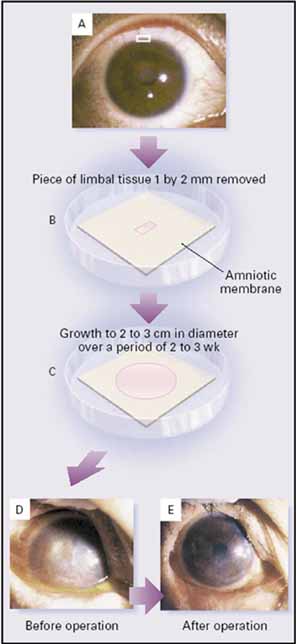 that continue to damage the stromal substrate. FIRST STRATEGY: RESTORE OCULAR SURFACE DEFENSE Before reconstruction, one should realize that keratinization in squamous metaplasia and vascularization in LSCD are two important pathologic mechanisms to prevent such corneal complications as epithelial defects, ulcers, or melt in eyes without an unstable tear film. Therefore, one should avoid performing conventional corneal transplantation to correct these two types of corneal failures if the ocular surface defense cannot first be restored. Because ocular surface reconstruction aims to restore a clear avascular cornea, which will require a stable tear film to maintain its health (see “Basic Concepts” section), it is of utmost important to restore a sound ocular surface defense. If not restored or unable to be restored, poor ocular surface defense in these eyes represent a contraindication for corneal surface reconstruction with epithelial SC transplantation. Deficiencies in ocular surface defense can be recognized by history taking, and external and biomicroscopic examinations, and by the use of special tests such as dynamic tear function test, dye staining and impression cytology. Measures taken to correct severe aqueous tear deficiency dry eye include punctal occlusion and frequent application of autologous serum drops for mechanical microtrauma caused by lid margin and lash abnormalities such as trichiasis, entropion, or meibomian gland orifice metaplasia, which can be corrected by high oxygen permeability (Dk) contact lens, scleral contact lens, or appropriate plastic surgeries including mucous membrane graft. Symblepharon that causes obliteration of tear meniscus, misdirected lashes, inability of adequate blinking and closure, and motility restriction should also be corrected by fornix reconstruction before corneal surface reconstruction. Exposure problems may be corrected by Botox-induced ptosis, high DK contact lens, scleral lens, or tarsorrhaphy. SECOND STRATEGY: RESTORE STROMAL ENVIRONMENT The state and severity of LSCD can be graded as partial or total. In partial LSCD, a portion of the limbal SC remains intact. In partial or total LSCD, if the central cornea still preserves a normal corneal epithelial phenotype and satisfactory vision, treatments should be directed to maintaining the remaining corneal epithelium and to activating the remaining limbal SC. Besides bandage contact lens or scleral lens to shield against continuous attrition, one new way of expanding remaining limbal or conjunctival epithelial SC in vivo is to transplant preserved amniotic membrane to restore stromal environment that has been destroyed in diseases mentioned in Table 1. Amniotic membrane (i.e., the innermost layer of the placental membrane) consists of a simple epithelium, a thick basement membrane, and an avascular stroma. When appropriately procured and processed, cryopreserved amniotic membrane can be used as a surgical graft for substrate replacement and does not elicit immunologic reactions.19 A number of studies have shown that amniotic basement membrane facilitates epithelialization and maintains epithelial phenotype, while amniotic avascular stroma exerts anti-inflammatory, antiangiogenic and antiscarring effects [for reviews see Dua and Azuara-Blanco,20 Kruse et al.,21 Sippel et al.,22 and Tseng and Tsubota23), properties important for reconstruction of epithelium-lining tissues. For partial LSCD, debridement of conjunctivalized epithelium from the corneal surface24 with or without additional amniotic membrane transplantation25 is effective to restore the corneal surface. Because of its anti-inflammatory effect, amniotic membrane transplantation as a temporary patch (bandage) is also effective in restoring ocular surfaces during the acute attack of chemical burns26 and Stevens-Johnson syndrome27. THIRD STRATEGY: RESTORE EPITHELIAL STEM CELLS For corneal surface reconstruction, epithelial SC can be transplanted from the limbal epithelium. For conjunctival surface reconstruction, epithelial SC can be transplanted from the bulbar conjunctival epithelium, especially close to the fornix, where conjunctival epithelial SC are enriched.28 The following section is devoted to restoring corneal surfaces with LSCD. When LSCD is total, that is, involving the entire limbal SC of an eye, amniotic transplantation alone is ineffective, and corneal surface reconstruction requires transplantation of limbal epithelial SC. According to the type and source of tissue removed to transplant limbal epithelial SC, several surgical procedures have been devised, of which each terminology used herein adopts what has been recommended by Holland and Schwartz.29 Conjunctival Limbal Autograft When total LSCD is unilateral, conjunctival limbal autograft (CLAU) from the uninvolved fellow eye is advised.30 The surgical procedure for CLAU is shown in Figure 5. (To view surgical video, please contact Dr. Tseng at stseng@ocularsurface.com.) In brief, the conjunctivalized pannus is removed from the corneal surface by peritomy followed by superficial keratectomy with blunt dissection in the recipient eye (Fig. 5A). The cicatrix was removed from the subconjunctival space (Fig. 5B). This invariably results in the recession of the conjunctival edge to 3 to 5 mm from the limbus (Fig. 5C). Two strips of limbal conjunctival-free grafts, each spanning 6 to 7 mm limbal arc length, are removed by superficial lamellar keratectomy at 1 mm within the limbus from the superior and inferior limbal regions (Fig. 5D) and by including 5 mm of adjacent conjunctiva. These two free grafts are transferred and secured to the recipient eye at the corresponding anatomic sites by interrupted 10-0 nylon sutures to the limbus and 8-0 vicryl sutures to the sclera. The size of the limbal removal in CLAU can be adjusted according to the visual potential of the donor eye and the extent of LSCD in the recipient eye, and the amount of the conjunctiva can be increase