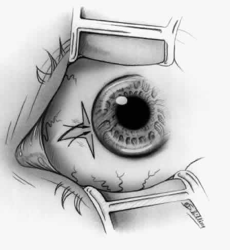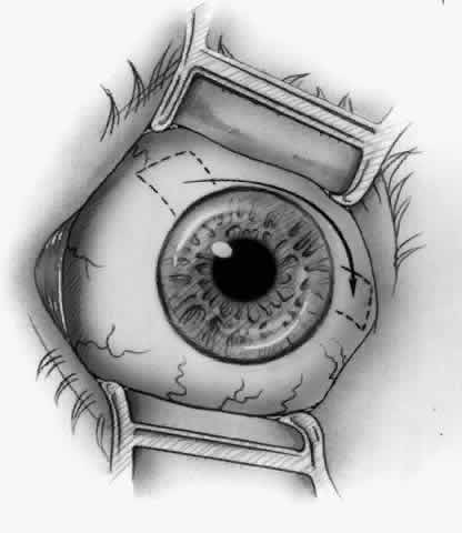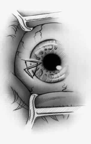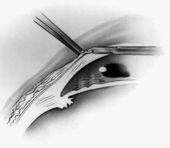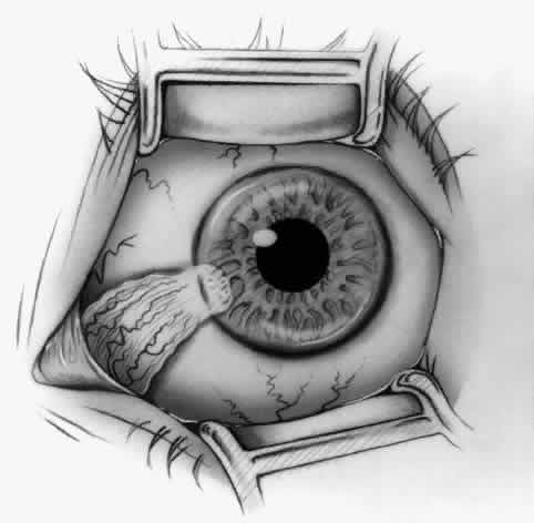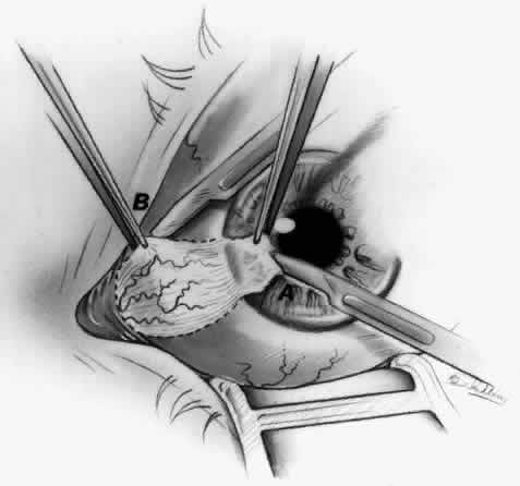 MEDICAL Mild symptoms of photophobia and injection from a small pterygium can often be managed by avoiding smoke- and dust-filled environments. Topical, preservative-free lubricants, vasoconstrictors, and a mild nonpenetrating corticosteroid, such as medrysone 1% (HMS: Allergan Pharmaceuticals, Irvine, CA) can safely relieve symptoms when used judiciously.7 To prevent progression, some authors have advocated the use of ultraviolet-blocking spectacles.14,18 Both UV-A and UV-B protection have been recommended by Taylor and associates based on the results of their epidemiologic study.18 SURGICAL The first report of a surgical treatment of pterygium is more than 3000 years old.34 Many variations of this procedure since that time have been published.13,35,36 Only the most common operative techniques in present use, with adjunctive therapies, are discussed here. Avulsion A technique practiced by the ancient Greeks is avulsion of the pterygium. Refinements of the technique have been described in modern times.34,37-40 Its contemporary proponents contend that the operation is simple and avoids accidental, deep dissection into the cornea when the apex of the pterygium is removed.41 The recurrence rate (23%–75%) is similar to other techniques for primary removal.42 Excision (Bare Sclera) One of the most popular methods for the removal of primary pterygium is excision of all remnants of the pterygium, leaving the underlying bare sclera exposed (Fig. 2). Sharp dissection from the corneal side and from the uninvolved perimeter of normal conjunctiva is necessary. The cornea is left as smooth as possible, and all of Tenon's capsule from beneath the pterygium is excised.