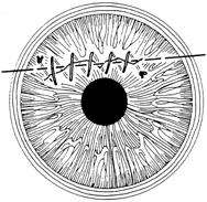 With more complex lacerations, good wound apposition with minimal distortion is the goal. An irregular wound is first subdivided into straight segments with interrupted sutures. Perpendicular areas of the laceration should be sutured before beveled ones to achieve watertight closure with the fewest number of sutures. As suggested by Rowsey and Hays,7 long, deep, and relatively tight peripheral wound sutures in combination with shorter, shallower, appositional sutures near the visual axis may help restore the normal corneal contour by restoring the relatively steep central corneal dome (Fig. 8). For irregular or curvilinear lacerations, all interrupted sutures should be placed perpendicular to the wound, thus avoiding transverse shifting of the wound margins. Although a running shoestring suturing technique may be used with straight lacerations to minimize astigmatism and facilitate subsequent suture removal, a running suture may tend to distort an irregular or curvilinear laceration because it will tend to form a straight line. Thus, if used, running suture bites should be placed perpendicular to and equidistant from an imaginary “regression” line through the wound rather than with respect to the wound itself (Fig. 9).