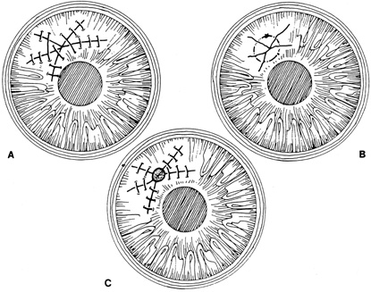 To facilitate subsequent suture removal from the cornea, a locked 2-1-1 knot or a 1-1-1 slipknot may be used. All suture knot ends should be trimmed short and then buried superficially on the side away from the visual axis. This minimizes scarring, inflammation, neovascularization, and buildup of mucus. The knot should be buried by directing the ends away from the surface to ease future removal (Fig. 10). Once the laceration is repaired, the anterior chamber should be deepened, preferably through the paracentesis port, if not through the wound itself. The wound is then checked for leaks using dry cellulose sponges or 2% fluorescein sodium. The paracentesis port is usually self-sealing; however, if it is leaking, stromal hydration using a canula or closure with a single interrupted 10-0 nylon suture may be necessary. STELLATE CORNEAL LACERATIONS. Stellate lacerations and partial tissue avulsions are often difficult to repair because it is difficult to obtain watertight closure. Good tissue apposition is often difficult to obtain. Several techniques may be used for stellate lacerations. These include multiple interrupted sutures, bridging sutures, pursestring sutures, and star-shaped sutures9. If closing a stellate laceration is difficult, and leaking persists, tissue adhesive or a corneal patch graft may be used (Fig. 11).