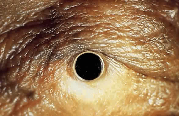 rate have recently been described.28 The major complication is necrosis of tissue around the keratoprosthesis (Fig. 5). Unless treated, this can lead to subsequent tissue breakdown (melt), aqueous leak, infection, or retinal detachment. Certain measures reduce the risk of such calamities. Thus, the type I keratoprosthesis in the wet and adequately blinking eye is usually covered with a total conjunctival flap. This is left in place for 2 months before opening, which reduces the incidence of subsequent necrosis. The use of collagenase enzyme-suppressing medication also lowers the incidence of this complication. However, in some cases necrosis still occurs. It typically begins around the edge of the cornea adjacent to the optical stem. If identified early, various repair mechanisms can be attempted to halt the process. A thin slice of corneal tissue with a central 3-mm trephined hole and a radial cut can be slipped under the anterior plate and sutured in place.25 In many instances, this reinforces the base of the keratoprosthesis and allows further stabilization of the device. In some cases, this new donor cornea material becomes vascularized early; this is a favorable sign because it generally is associated with long-term retention of the added tissue. Once repaired, the patients need to be followed up closely. In some of these patients, more melting will occur, and they may require a further procedure. However, with the passage of time, the need for subsequent repair decreases markedly. Skin retraction away from the plastic stem may occur with the type II keratoprosthesis. If allowed to proceed, it can again lead to subsequent leakage, infection, and extrusion. In the early stages, retraction can be repaired by mobilizing the surrounding skin and suturing it to keep the skin snug against the optical stem. Repeated skin revisions may be necessary in the initial postoperative period (see Fig. 5), but, once again, with the passage of time the situation tends to stabilize, with fibrosis occurring around the base of the keratoprosthesis stem. Postoperative uveitis occurs frequently after keratoprosthesis surgery. It can be associated with subsequent secondary problems, such as the formation of retroprosthetic membranes and vitreous changes. This usually abates after a month or two. Long-term uveitis is rare but can result in persistent vitreous haze and membrane formation, retinal pathology, and even detachments. As mentioned previously, the use of corticosteroids by the peribulbar route, in particular in the early postoperative period, has reduced the incidence of uveitis significantly and has also reduced the incidence of secondary retroprosthesis membranes. With the more liberal use of corticosteroids in the postoperative period, retroprosthetic membranes are less common. When they do occur, it is usually possible to open the membranes using the YAG laser. The back plate of the keratoprosthesis has a laser ridge that will keep the membrane away from the stem. In a few patients, a dense retroprosthesis membrane that is not amenable to opening with the YAG laser may require surgical opening with a Zeigler knife or a vitrectomy cutting instrument. Glaucoma is a common complication after keratoprosthesis surgery and is one of the more common direct causes of eventual blindness. Its pathogenesis is probably multifactorial. It may be associated with prolonged uveitis, giving rise to trabecular meshwork blockage by inflammatory cells or the development of peripheral anterior synechiae. One of the major difficulties with these patients is monitoring intraocular pressure after surgery. Obviously, tonometers are useless in this setting, and digital palpation of the globe is the only method available to obtain a rough estimate of intraocular pressure. Disc appearance can be assessed using the 90 diopter lens or direct ophthalmoscopy, and disc photographs can be taken at repeated intervals. Visual fields should be monitored on a frequent basis and can also be used to assess glaucoma damage. Treatment is limited because the topical absorption of antiglaucoma medications is impossible in the type II (through-the-lid) patients. In the type I setting, topical medication has some penetration, as can be demonstrated by the action of topically applied phenylephrine on the pupil. Systemic carbonic anhydrase inhibitors are the mainstay of treatment. Bearing these difficulties in mind, in both the postoperative monitoring and treatment of glaucoma, most of our patients now receive an Ahmed valve glaucoma shunt, which is implanted together with the prosthesis.29 Retinal detachment is fortunately not a common complication. It may be rhegmatogenous in nature and is probably associated with peripheral retinal breaks. In some patients, tractional retinal detachment occurs, particularly after chemical burns. Presumably this is secondary to the development of inflammatory vitreoretinal membranes stimulated by prolonged postoperative uveitis. Unfortunately, once a retinal detachment has occurred, treatment is rarely successful. Infection is uncommon in the early postoperative period, but endophthalmitis can occur at any stage after surgery. Early detection and treatment of tissue melts can help reduce this complication. Nonetheless, patients sometimes present with a fulminant endophthalmitis with no obvious source of leakage around the keratoprosthesis. The outcome is usually devastating. It is our impression that patients with Stevens-Johnson syndrome are particularly prone to infection; this may be due to the fact that their tissue damage is so profound from chronic inflammation. Accordingly, we treat these patients with prophylactic antibiotics, both during and for prolonged periods after surgery. |