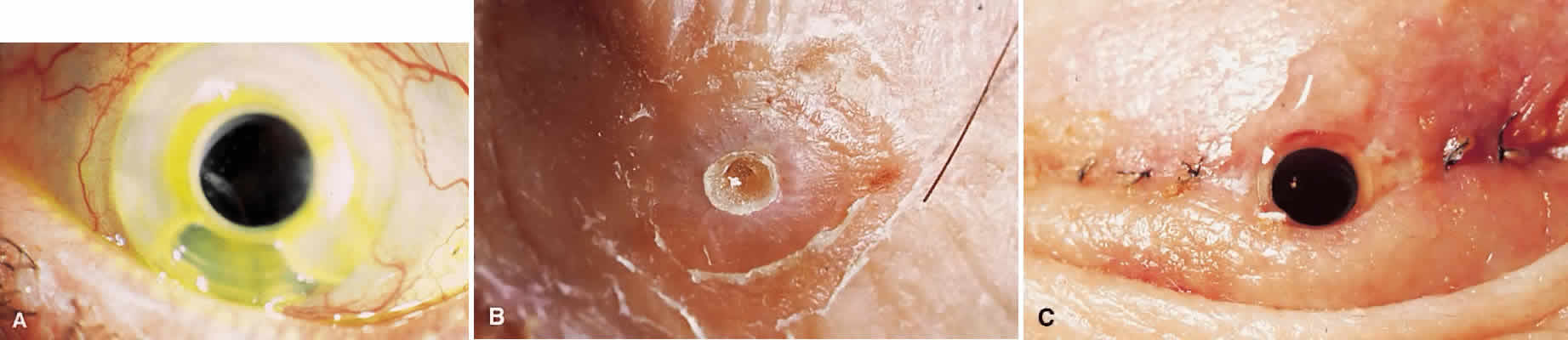 on our surgical technique have been previously described.25 In the early postoperative period, it is desirable that the conjunctival flap does not retract, because attempts at repair are usually futile. Extensive surgery, such as is done in keratoprosthesis, is associated with considerable postoperative inflammation. Accordingly, we have found that small doses of corticosteroids are needed, especially in eyes with a previous history of severe inflammation (e.g., Stevens-Johnson syndrome, pemphigoid, chemical burns). Routinely, 10 mg dexamethasone is given by peribulbar injection through the lower lid at the completion of surgery. After 2 to 3 weeks, 20 to 40 mg triamcinolone may be administered by peribulbar injection if inflammation persists. The total dose of corticosteroids may be difficult to judge: too much may jeopardize wound healing, leading to necrosis, fistulas, or leak of tears. Once the flap has been opened, it is easier to monitor the anterior chamber and vitreous reaction. If postoperative uveitis is still present, peribulbar steroids may have to be continued. Occasionally, in patients with Stevens-Johnson syndrome or ocular cicatricial pemphigoid, systemic immunosuppression in the form of oral steroid treatment or other immunosuppressive agents is indicated. Intravenous antibiotics are administered at the time of surgery. After surgery, patients are given topical antibiotic drops and a 14-day course of oral antibiotics. We usually prescribe topical antibiotic drops for a prolonged period. These are rotated every 2 to 3 months to prevent the development of resistant organisms. Patients with Stevens-Johnson syndrome who are particularly at risk for infection need to be monitored closely and should probably take topical antibiotics for life. After approximately 2 months, when the conjunctival flap or lid skin is opened, the patient is given topical anticollagenase medication. We use 1% medroxyprogesterone, which reduces collagenase synthesis, and a 1% tetracycline solution, which is a potent direct enzyme inhibitor. Although the efficacy of these agents in reducing corneal necrosis has not been established in humans, their beneficial effects have been well documented in experimental animals.26,27 Unfortunately, these suspensions are not commercially available and have to be made up in a hospital pharmacy. Patients are seen frequently in the early postoperative period and are advised to report any symptoms of pain, lid edema, blurred vision, or discharge from the eye. The goal should be to achieve a noninflamed eye with intact tissue around the device (Figs. 3 and 4).