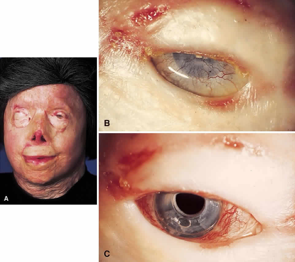 associated with past long-term inflammation (e.g., cicatricial pemphigoid, Stevens-Johnson syndrome, alkali burn). The Ahmed