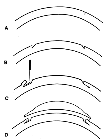 The concept of using a surgical procedure to change the refractive power of the anterior corneal surface was developed by Barraquer in the 1960s and 1970s.1 The precursors of epikeratoplasty, keratomileusis and keratophakia, proved to be technically challenging and demanding of the surgeon because they required expertise in manufacturing a donor lenticule using the cryolathe. In the hands of experienced surgeons, the results were quite good. However, for these procedures to be performed by many surgeons, they needed to be simplified. |