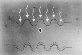 discussed in further detail in the following. Many of these sources of surface irregularity also are associated with corneal opacities. In some cases, smoothing the optical surface alone significantly improves the patient's visual function without the hyperopic shift and potential scarring that can be associated with the deeper ablations often necessary for removal of opacities. Hard contact lens refraction can be helpful in determining what component of a patient's visual complaints is secondary to surface irregularity alone. The improvement in visual acuity with a hard contact lens is attributable to irregularity, and the remaining vision impairment with the hard contact lens in place is caused by the opacity. Irregularities are not intrinsically removed by exposure to repeated pulses of the excimer beam. Photons that encounter an irregular surface do not discriminate between elevations and depressions, and tissue that is removed largely replicates the original irregularity (Fig. 3). Strategies have been devised to protect the deeper tissues (valleys) while exposing elevated pathology (peaks) to the ablating photons. Epithelial hyperplasia commonly occurs in areas of corneal depression. Performing transepithelial ablation, where the thickened epithelium shields the valleys from the laser energy, therefore, can take advantage of the natural masking effect of the epithelium. As an example, one strategy for removing surface irregularities of Reis-Bucklers' dystrophy involves ablating through the epithelium that is intermixed with the abnormal substance until the epithelium is largely absent. This absence is determined by the disappearance of the fluorescence that occurs during epithelial ablation. Further ablation then is performed in conjunction with the use of masking fluids. The most commonly used masking fluids are artificial tear substances, which are available in varying viscosity. Kornmehl and coworkers compared artificial tear substances of varying viscosity with saline and a nonfluid control in an experimental model of surface irregularity.64 In a model in which the corneal surface initially was roughened with sandpaper, solutions of moderate viscosity yielded a smoother surface than more viscous artificial tears, and markedly better results than the nonviscous saline solution. All of these fluids outperformed the nonfluid control. A subsequent study found good results with a preparation of 0.25% sodium hyaluronate.65 Figure 4 shows the theoretic concept that a fluid with inadequate viscosity tends to run off, providing insufficient protection for the valleys, whereas a substance that is too viscous drapes over the peaks, protecting the elevations, where ablation is desired. In addition to the effect of viscosity, different solutions may have varying effectiveness in the absorption of 193-nm photons. A thin film of fluid must have adequate absorption to prevent ablation of the underlying tissue. Enhancing absorption at 193 nm may be one step toward the development of a more effective masking fluid for phototherapeutic keratectomy of an irregular surface. A substance such as a gel also could be applied uniformly over the cornea and molded into a new, smooth anterior surface. This gel would be ablated and, as ablation progresses, would expose the peaks while protecting the valleys without the need for repeated artful application of viscous fluids. For this gel to be fully effective, however, the ablation rate of the gel would have to match that of the pathologic tissue. Such a gel has yet to be implemented in clinical practice.66,67 |