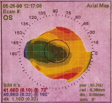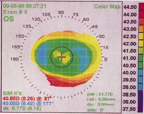 of all types of astigmatism. Wiesinger-Jendritza and associates reported a series of 23 eyes treated with LASIK using topography-based ablations for irregular astigmatism after penetrating keratoplasty, trauma, or previous excimer laser surgery.99 They found that 61.9% were partially corrected and 19.4% were fully corrected after the treatment. Improvements in this technique will likely be seen as topographic analysis becomes incorporated into the laser for real-time feedback on topographic changes during the ablation. Vinciguerra and Camesasca also have reported good results with a topography-based custom therapeutic treatment of highly aberrated eyes.100,101 In 52 eyes, the percentage with BSCVA of 20/30 or better increased from a preoperative rate of 59% to 88% at one postoperative year, and BSCVA of 20/15 was reached by 25% of eyes compared to none preoperatively. |